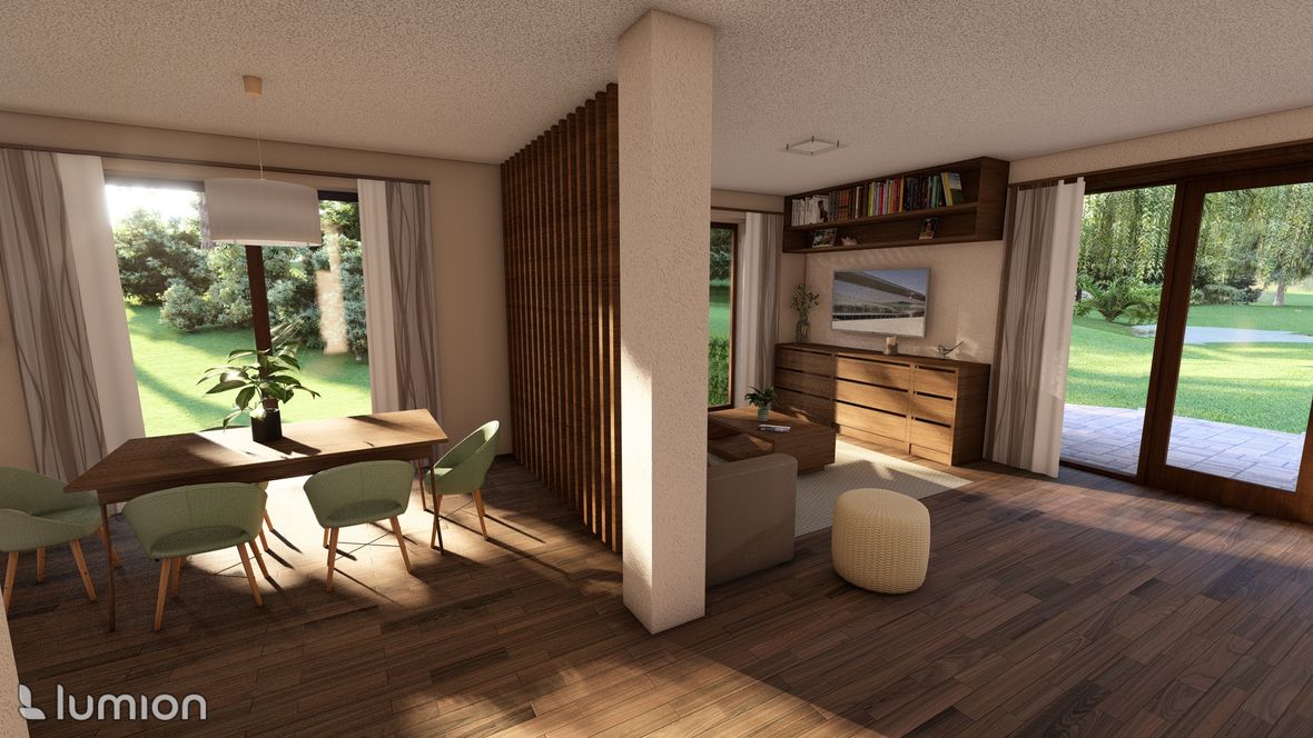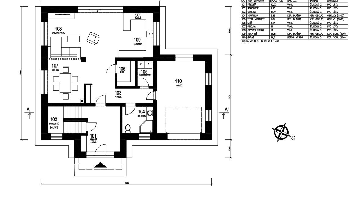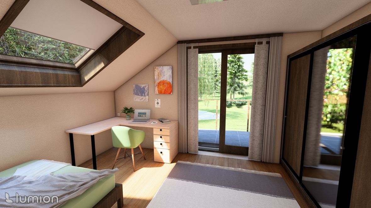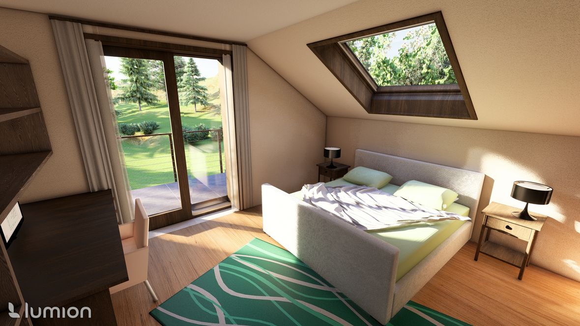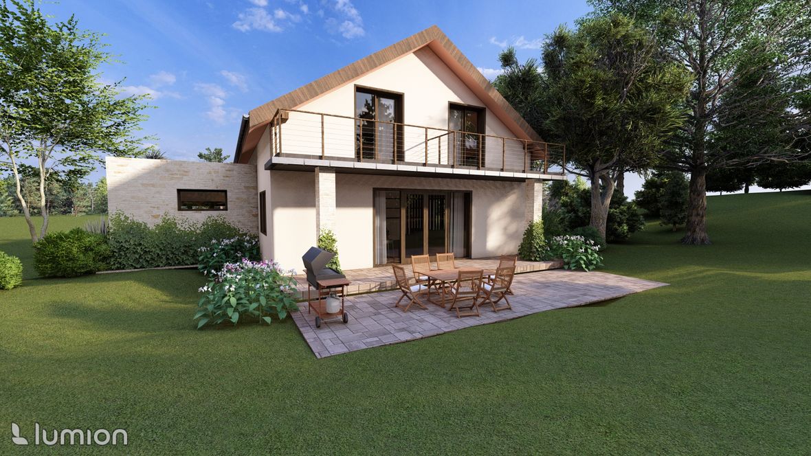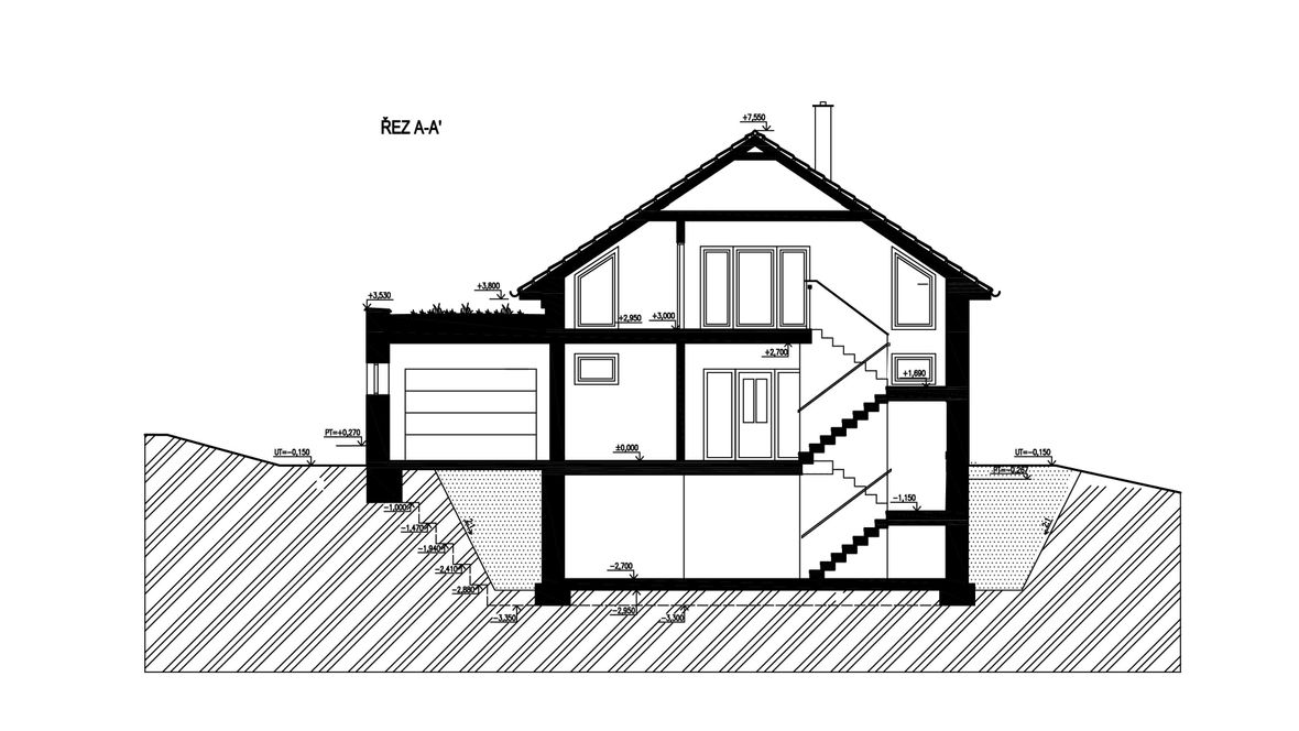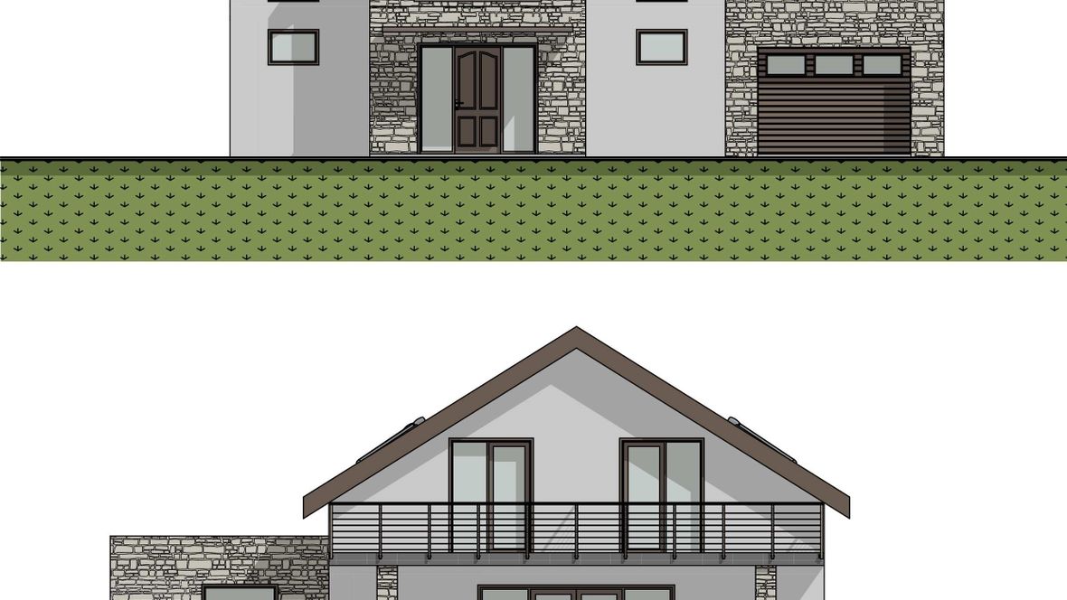 Třípodlažní rodinný dům Carmen je navržen pro příjemné bydlení čtyřčlenné rodiny. Na předním pohledu budovy jsou dvě zkosená okna, která téměř lícují s šikmou střechou. Spolu s ostatními okny a dveřmi jsou tmavě hnědé barvy. Vystouplá část domu, garáž a sloupy jsou pokryty kamenným obkladem a zbytek fasády světle krémovou omítkou. V 2. patře se nachází okna Velux GLL. Na zelené střeše nad garáží, je světlík Velux CFU