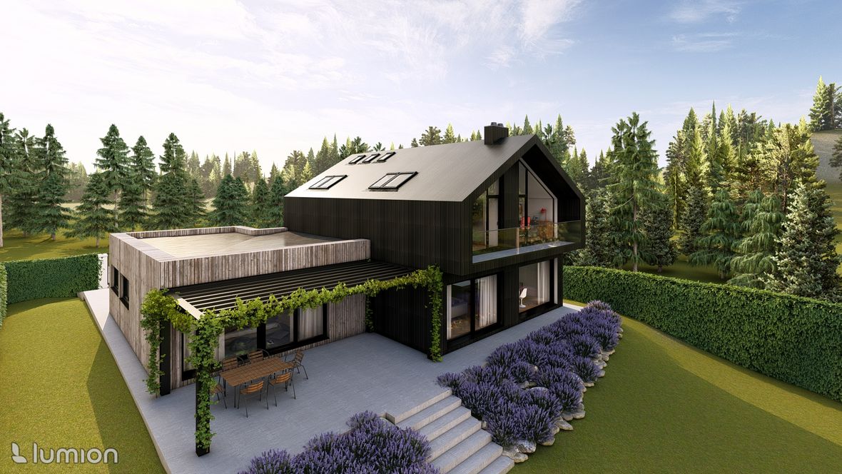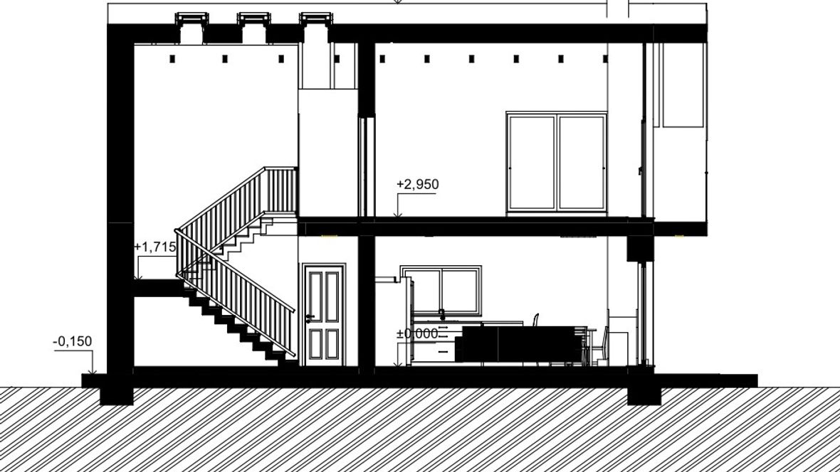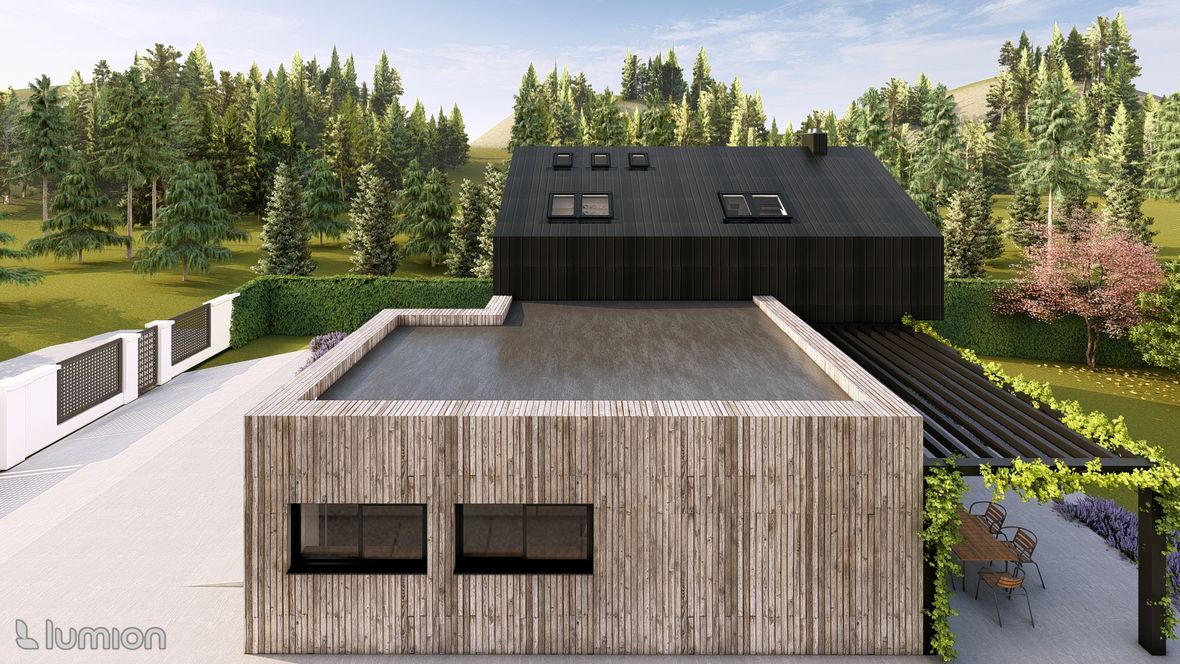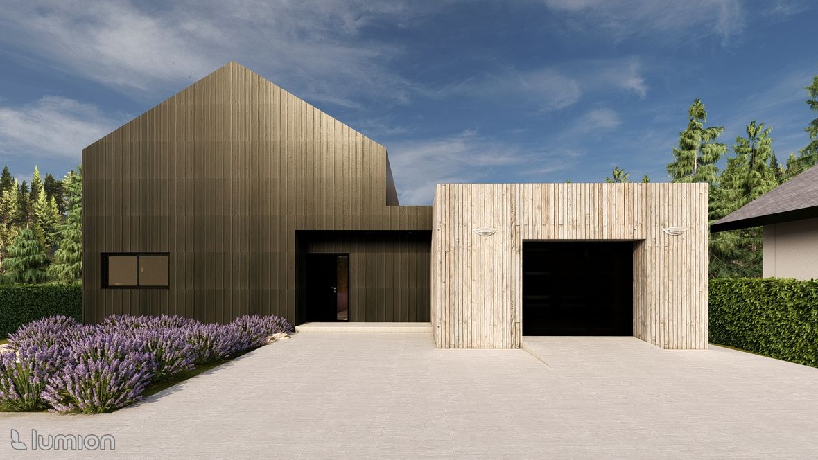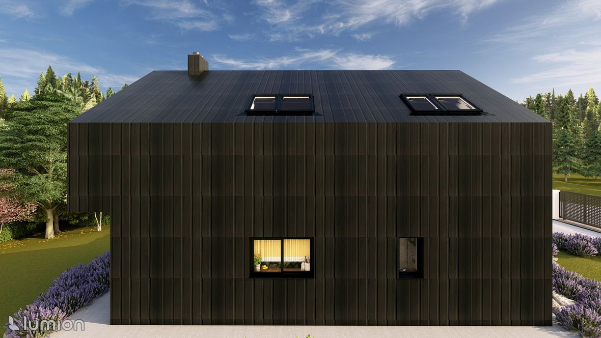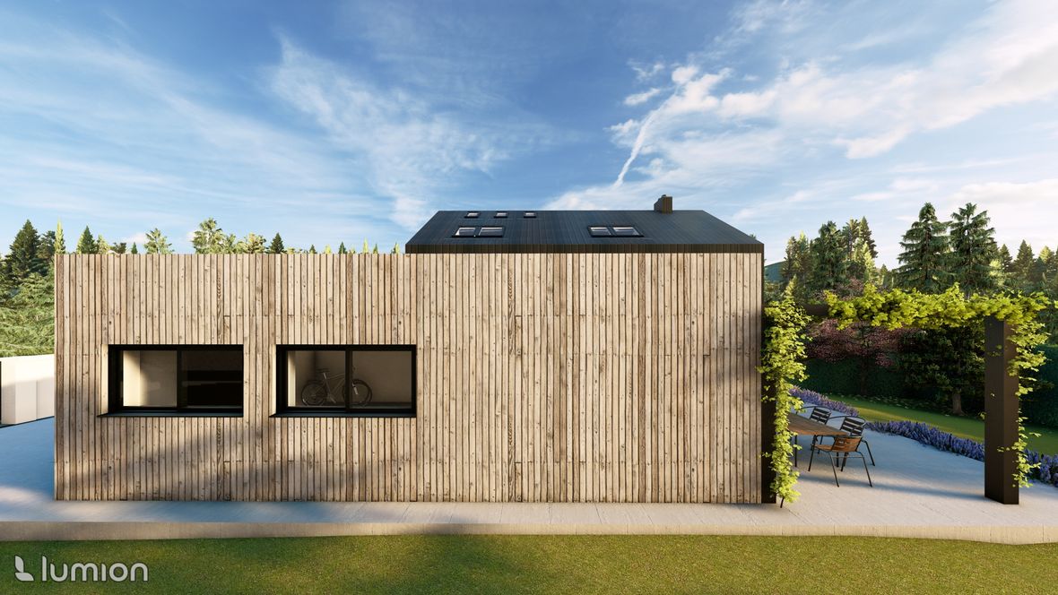 Popis projektu: Jedná se o studii rodinného domu o dvou nadzemních podlažích, pro čtyřčlennou rodinu s vnitřním prostorem, který bude celodenně prosvětlen. Architektonické a dispoziční řešení: Navrhovaný objekt má dvě nadzemní podlaží, bez suterénu, zastřešen je sedlovou střechou a přístavba, která bude sloužit jako garáž, je zastřešena plochou jednoplášťovou střechou. Půdorys je členitý s maximálními rozměry 13,15 x 15,00 m. Objekt má jeden hlavní vstup, který se nachází na severní straně rodinného domu a vede přímo do prvního nadzemního podlaží. V 1.NP se nachází dále kuchyně s jídelnou a obývacím pokojem na jižní straně objektu se vstupem na terasu. Na jižní straně domu se také nachází ložnice se vstupem na terasu a dále se v prvním podlaží nachází koupelna, WC, schodiště do 2.NP, zádveří a technická místnost, která také slouží k vstupu do garáže. 2.NP tvoří soukromou obytnou část s pokoji, pracovnou a koupelnou, ve které se nachází také WC. Minimalistického architektonického výrazu objektu je dosaženo díky dřevěného obložení garáže a plechovým obkladem v barvě RAL7016, pokrývající fasádu rodinného domu. Nejvýraznějším prvkem celého objektu je pravděpodobně štítová prosklená stěna, s vyložením v 2.NP a směřujícím do zahrady. Řešení prosvětlení: K prosvětlení společenských a také obytných místností rodinného domu, slouží francouzská okna, nacházející se na jižní straně objektu, která jsou vybavena roletami s automatickým stíněním. V objektu se také nachází tradiční plastová okna s izolačním trojsklem. K dodatečnému prosvětlení místností v 2.NP slouží střešní okna Velux GLL.