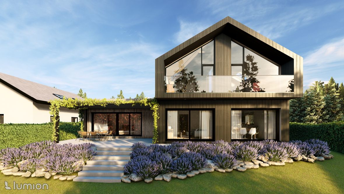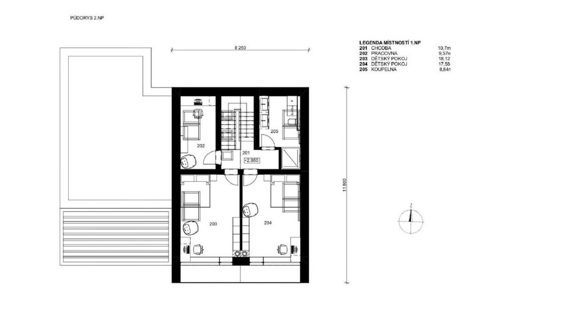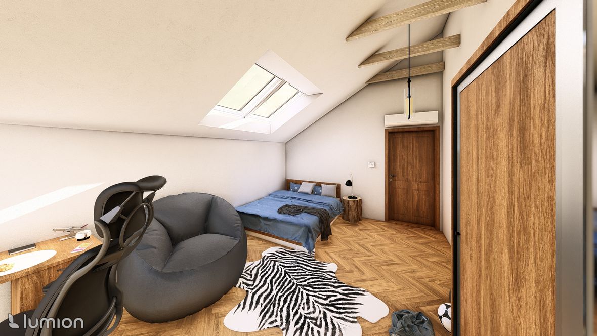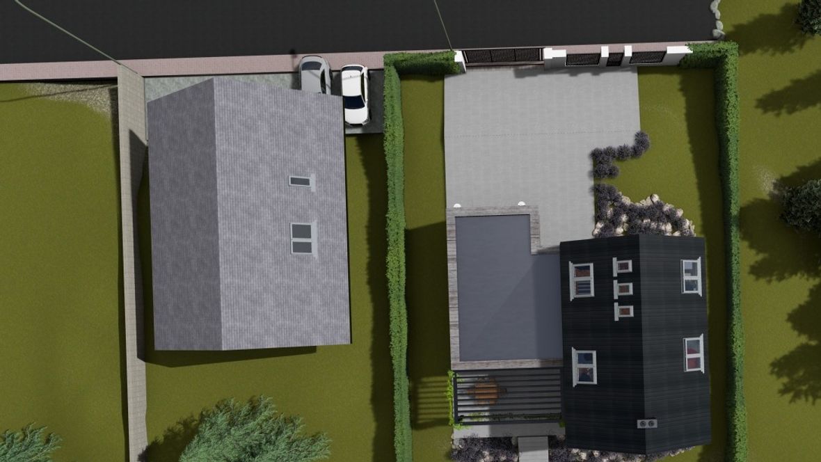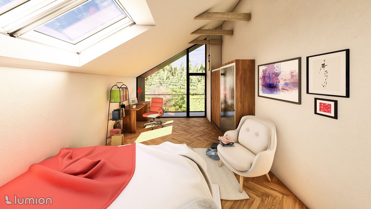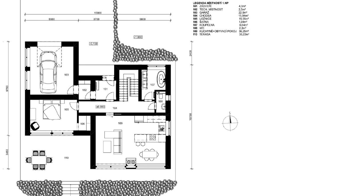 Popis projektu: Jedná se o studii rodinného domu o dvou nadzemních podlažích, pro čtyřčlennou rodinu s vnitřním prostorem, který bude celodenně prosvětlen. Architektonické a dispoziční řešení: Navrhovaný objekt má dvě nadzemní podlaží, bez suterénu, zastřešen je sedlovou střechou a přístavba, která bude sloužit jako garáž, je zastřešena plochou jednoplášťovou střechou. Půdorys je členitý s maximálními rozměry 13,15 x 15,00 m. Objekt má jeden hlavní vstup, který se nachází na severní straně rodinného domu a vede přímo do prvního nadzemního podlaží. V 1.NP se nachází dále kuchyně s jídelnou a obývacím pokojem na jižní straně objektu se vstupem na terasu. Na jižní straně domu se také nachází ložnice se vstupem na terasu a dále se v prvním podlaží nachází koupelna, WC, schodiště do 2.NP, zádveří a technická místnost, která také slouží k vstupu do garáže. 2.NP tvoří soukromou obytnou část s pokoji, pracovnou a koupelnou, ve které se nachází také WC. Minimalistického architektonického výrazu objektu je dosaženo díky dřevěného obložení garáže a plechovým obkladem v barvě RAL7016, pokrývající fasádu rodinného domu. Nejvýraznějším prvkem celého objektu je pravděpodobně štítová prosklená stěna, s vyložením v 2.NP a směřujícím do zahrady. Řešení prosvětlení: K prosvětlení společenských a také obytných místností rodinného domu, slouží francouzská okna, nacházející se na jižní straně objektu, která jsou vybavena roletami s automatickým stíněním. V objektu se také nachází tradiční plastová okna s izolačním trojsklem. K dodatečnému prosvětlení místností v 2.NP slouží střešní okna Velux GLL.