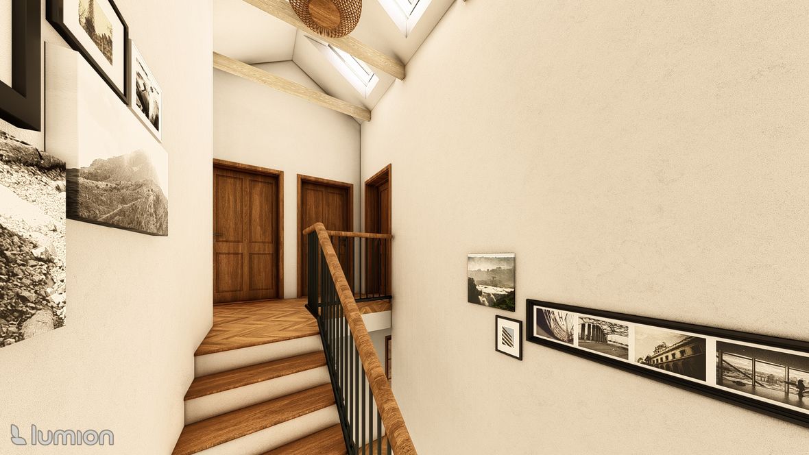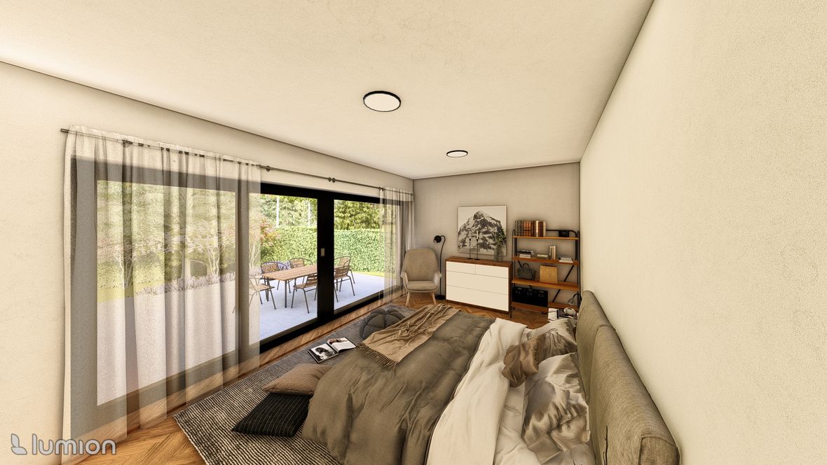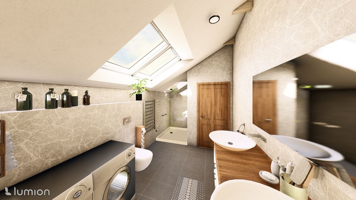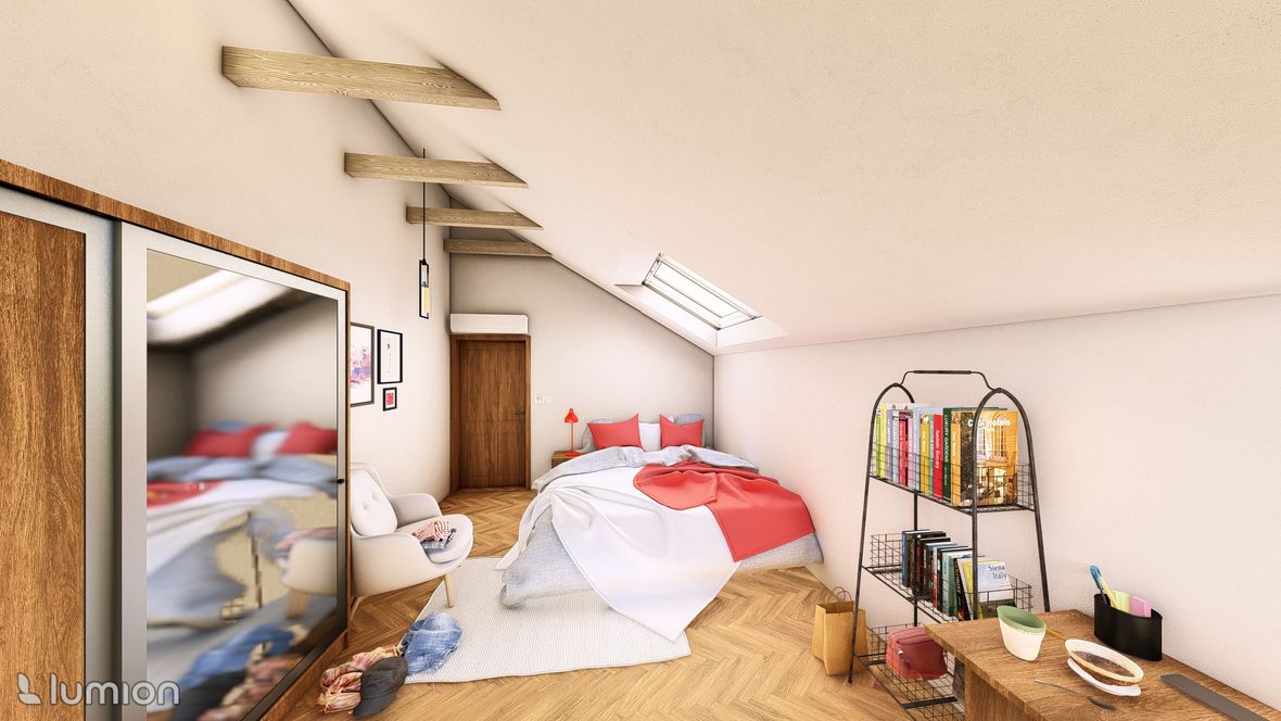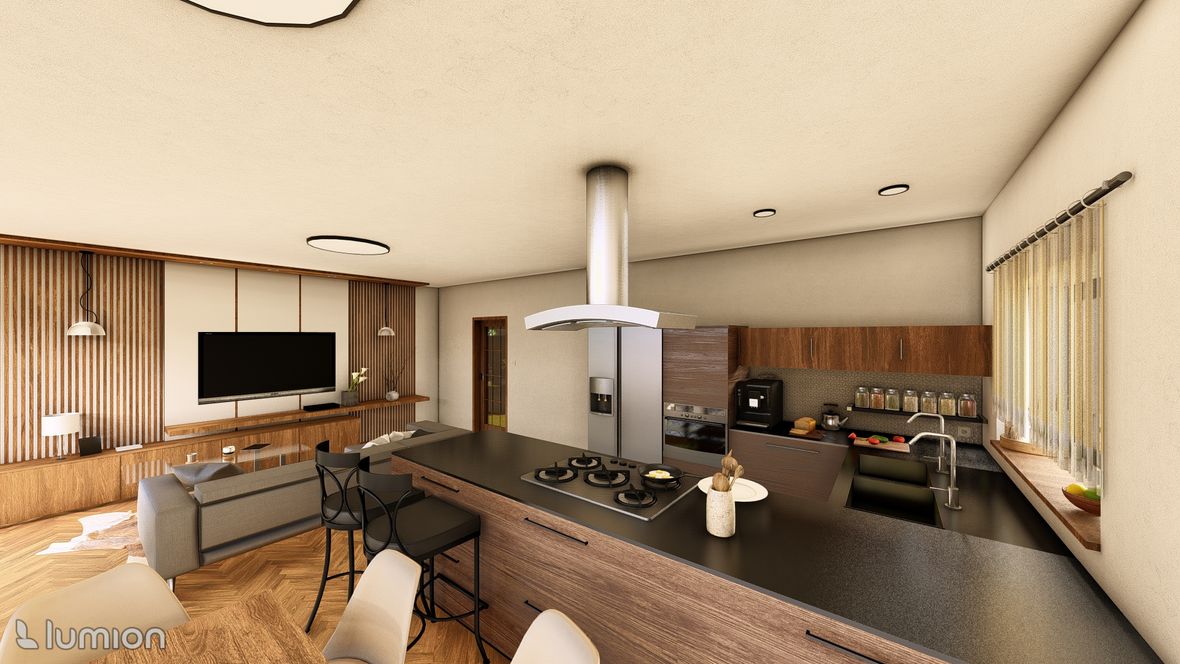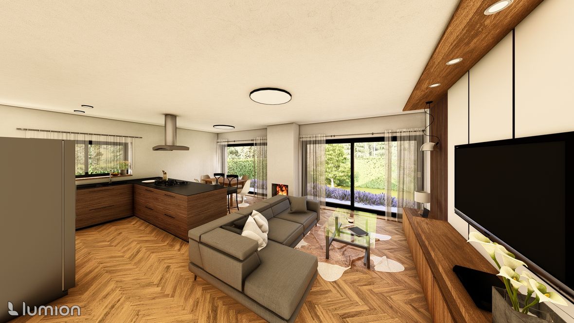 Popis projektu: Jedná se o studii rodinného domu o dvou nadzemních podlažích, pro čtyřčlennou rodinu s vnitřním prostorem, který bude celodenně prosvětlen. Architektonické a dispoziční řešení: Navrhovaný objekt má dvě nadzemní podlaží, bez suterénu, zastřešen je sedlovou střechou a přístavba, která bude sloužit jako garáž, je zastřešena plochou jednoplášťovou střechou. Půdorys je členitý s maximálními rozměry 13,15 x 15,00 m. Objekt má jeden hlavní vstup, který se nachází na severní straně rodinného domu a vede přímo do prvního nadzemního podlaží. V 1.NP se nachází dále kuchyně s jídelnou a obývacím pokojem na jižní straně objektu se vstupem na terasu. Na jižní straně domu se také nachází ložnice se vstupem na terasu a dále se v prvním podlaží nachází koupelna, WC, schodiště do 2.NP, zádveří a technická místnost, která také slouží k vstupu do garáže. 2.NP tvoří soukromou obytnou část s pokoji, pracovnou a koupelnou, ve které se nachází také WC. Minimalistického architektonického výrazu objektu je dosaženo díky dřevěného obložení garáže a plechovým obkladem v barvě RAL7016, pokrývající fasádu rodinného domu. Nejvýraznějším prvkem celého objektu je pravděpodobně štítová prosklená stěna, s vyložením v 2.NP a směřujícím do zahrady. Řešení prosvětlení: K prosvětlení společenských a také obytných místností rodinného domu, slouží francouzská okna, nacházející se na jižní straně objektu, která jsou vybavena roletami s automatickým stíněním. V objektu se také nachází tradiční plastová okna s izolačním trojsklem. K dodatečnému prosvětlení místností v 2.NP slouží střešní okna Velux GLL.
