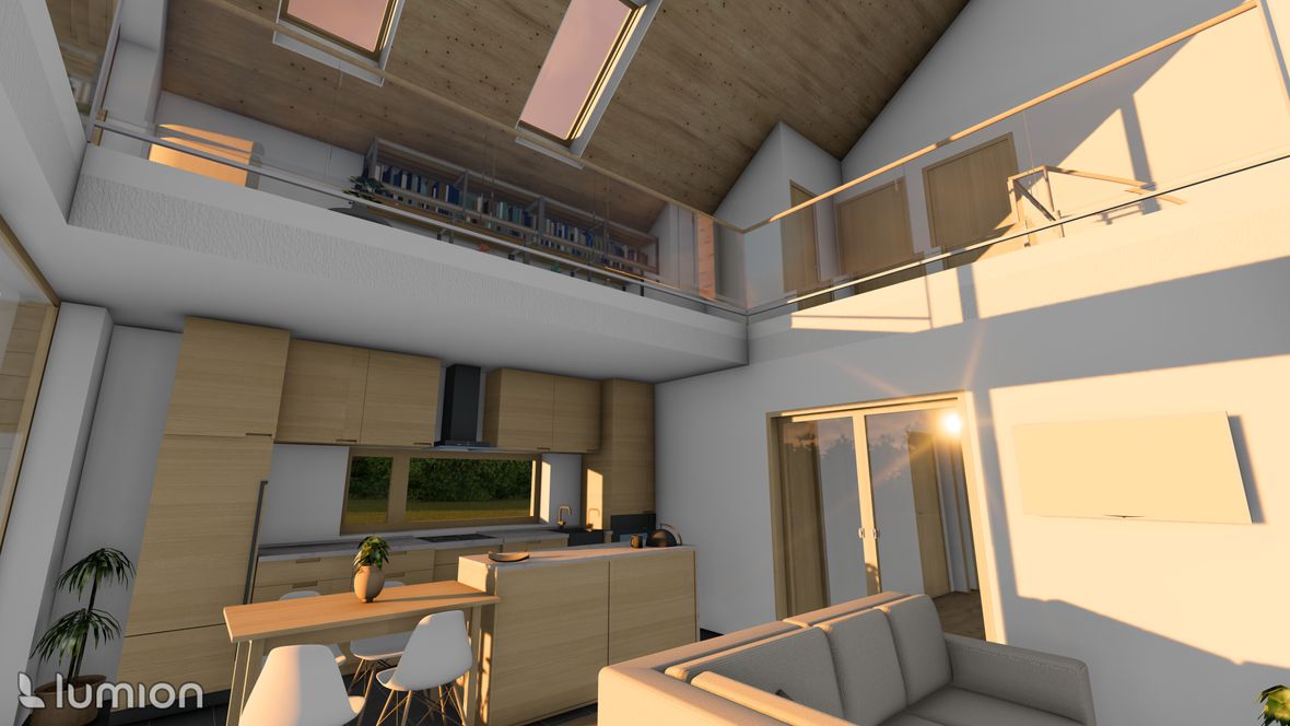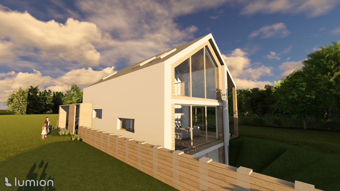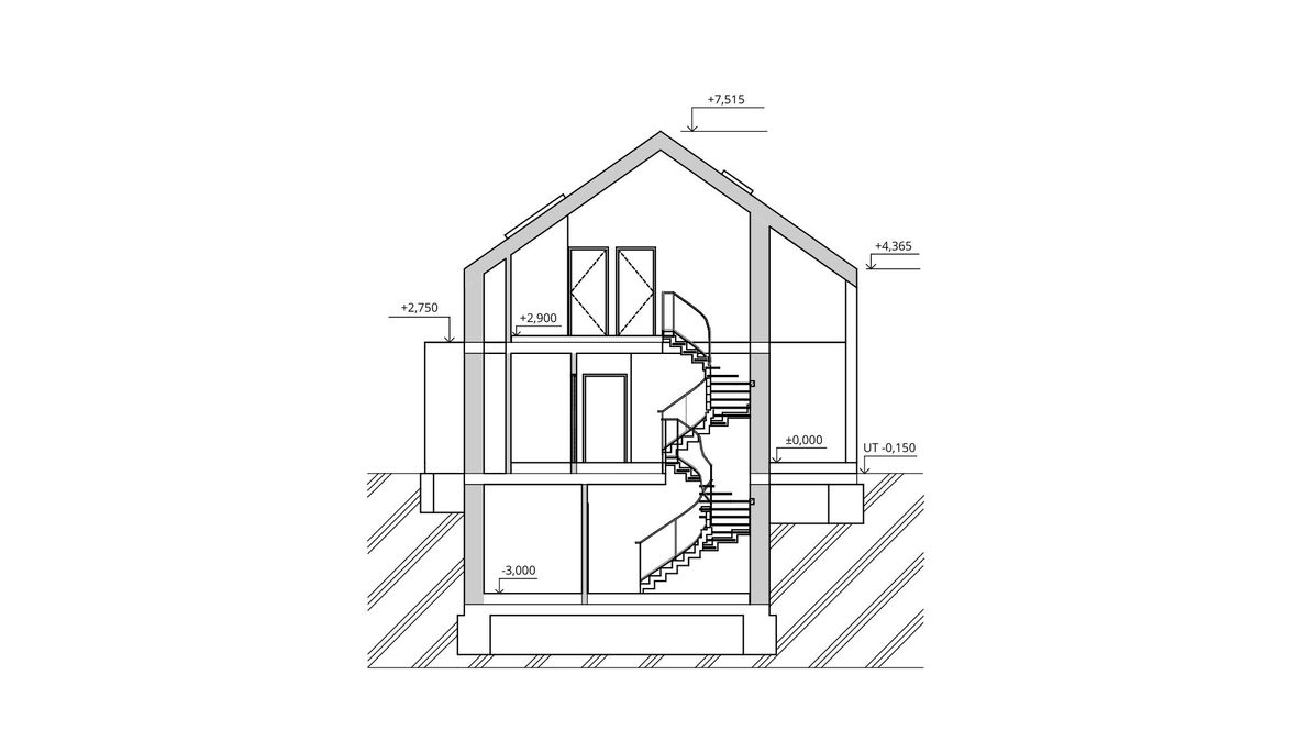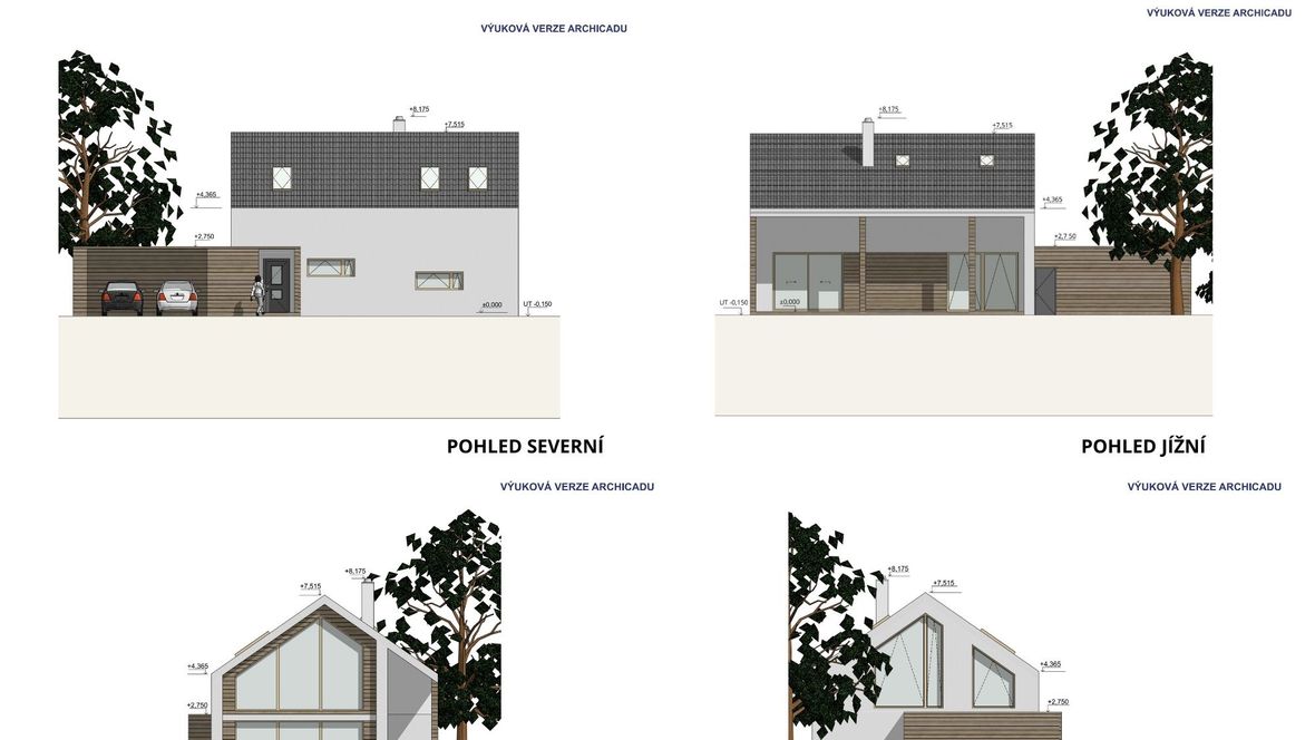 KONCEPT Konceptem, či hlavní myšlenkou při navrhování tohoto rodinného domu bylo navrhnutí útulného a prosluněného místa, kde se jednotliví členi domácnosti budou cítit dobře. ARCHITEKTONICKÉ A DISPOZIČNÍ ŘEŠENÍ Dům se skládá ze dvou hmot a to z hlavní (obytný prostor) a vedlejší (garáž). V prvním nadzemním podlaží najdeme zádveří, do kterého z venku vedou dva vchody, ze zádveří se dostaneme dále do chodby, odkud vedou dveře do koupelny, samostatného WC, pokoje a obývacího pokoje spojeným s kuchyňským koutem, z chodby také vede schodiště do podkroví a suterénu. V podkroví najdeme ložnici, druhý pokoj, WC a knihovnu, zajímavostí podkroví je propojená část s přízemím. V suterénu najdeme sklad a keramickou dílnu.