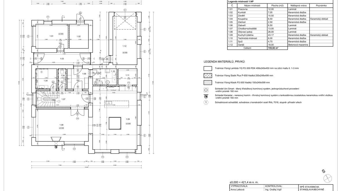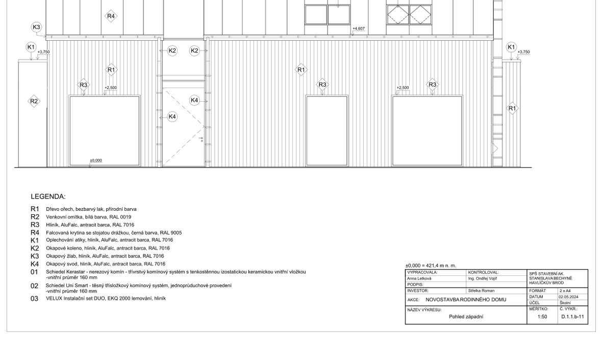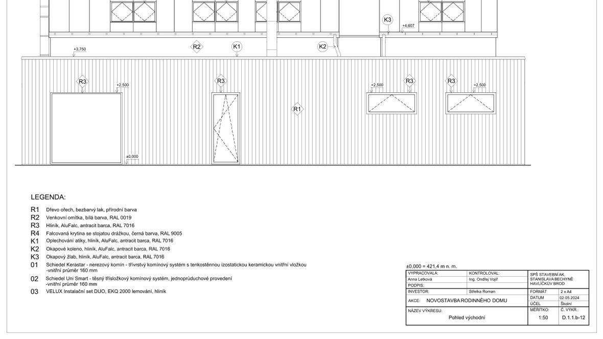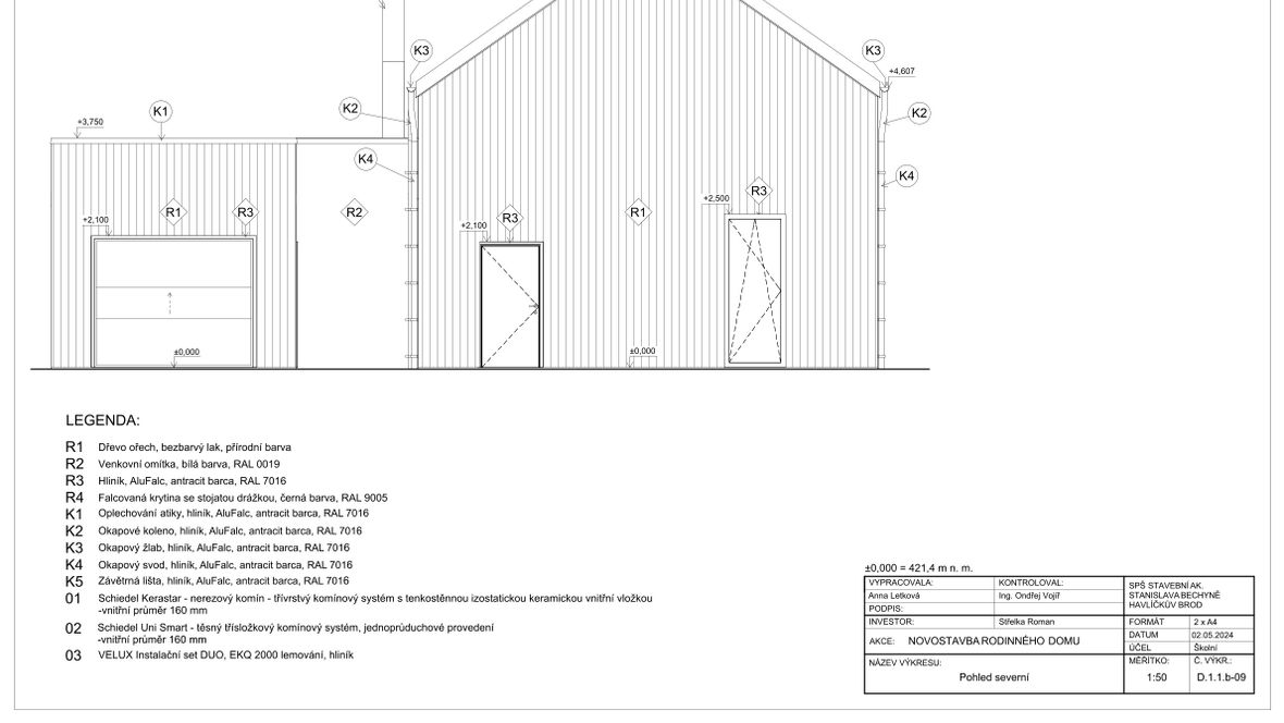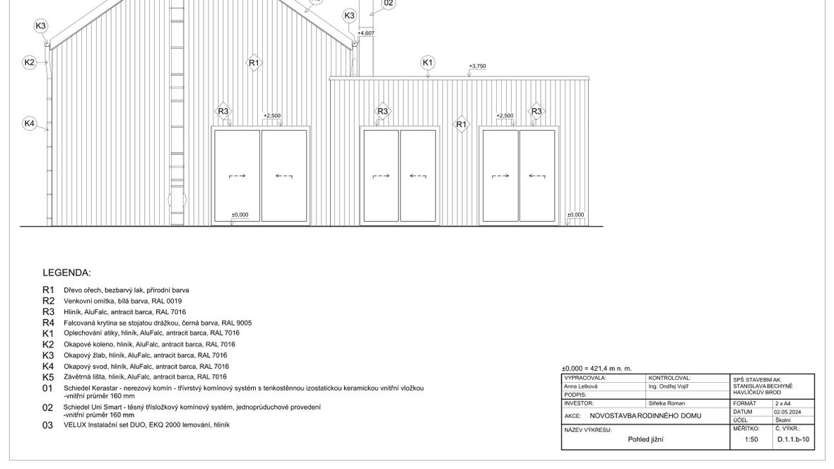 Jedná se o dvoupodlažní rodinný dům určený pro 4 členy domácnosti. Objekt disponuje plochou zelenou střechou a sedlovou střechou s falcovanou krytinou. Na objekt byl využit zděný systém YTONG včetně stropní nosníkové konstrukce a překladů. Krov je řešen hambalkovou soustavou. Založení stavby je realizováno pomocí plošných železobetonových pasů. K překonání výškového rozdílu mezi podlažími je realizováno ocelové schodnicové schodiště. U rodinného domu se nachází dvě parkovací místa, jedno kryté a jedno venkovní. Celková zastavěná plocha činí 208,750 m². K prosvětlení prostoru 1. nadzemního podlaží napomáhají velká francouzská okna. V 2. nadzemním podlaží je rozmístěno 6 Velux instalační set DUO střešních oken. Dále je nad kuchyní a jídelnou umístěn světlík, který je realizován v ploché střeše.