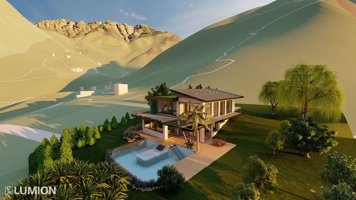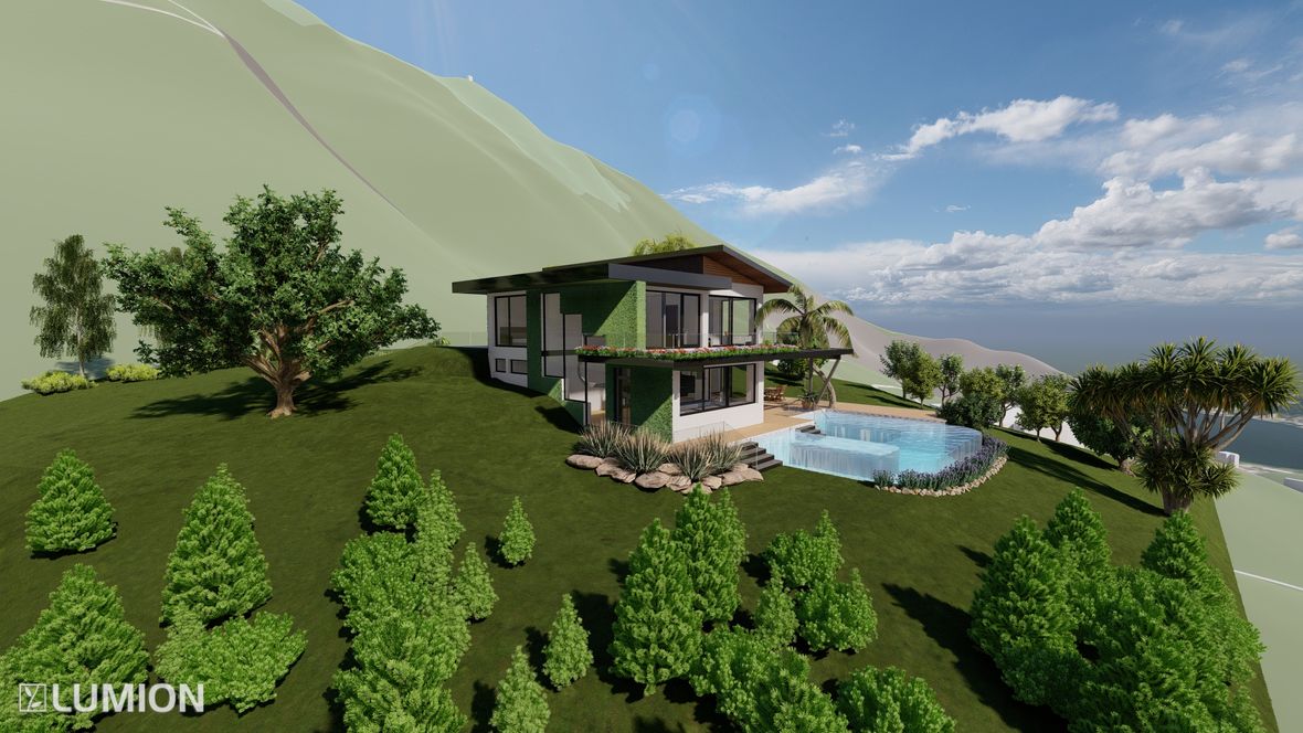 Tuto vilu jsem navrhl s velkým ohledem na prosvětlenost a také udržitelnost stavby. Stavba má tzv. zelené fasády a zelenou plochou střechu a díky těmto přírodním materiálům velmi pomáhá udržovat příjemnou teplotu v objektu. V zemině v zahradě je zakopaná retenční nádrž na dešťovou vodu, která slouží na zalévání a také jako tzv. šedá voda na splachování. Objekt má tepelné čerpadlo a automatickou rekuperaci vzduchu. Díky své pozici v horách je elektřina vyráběna pomocí malé vodní turbíny asi 300m od vily, která umožňuje ekologickou, udržitelnou a nepřetržitou výrobu elektřiny a proto není zapotřebí žádného akumulátoru na úschovu elektřiny. Voda je brána z místních tekoucích řek a ošetřována na stav pitné vody. Stavba je postavena z ekologicky nezávadných cihelných tvarovek s velmi dobrou tepelnou izolací. Všude jsou navrženy trojskla, která skvěle izolují ať už od zimy, ale také od hluku. Rámy oken a dveří jsou z kvalitních kombinovaných materiálů (hliník + dřevo). Střecha je zateplena pomocí recyklovaného nehořlavého papíru - Celulóza a dřevovláknitých izolačních desek. Krytina je plastová - Ekoternit, vyrábí z PVC, kdy jeho podstatnou složku tvoří recyklovaný materiál. Dlažby a obklady jsou kamenné z místní lokality. Podlahy v interiéru jsou z masivních dřevěných prken a dřevěných parket z regionálně pěstovaného dřeva. Jsou použity přírodní barvy, lepidla a laky na rostlinné bázi, bez rozpouštědel a s nízkým obsahem těkavých organických látek.