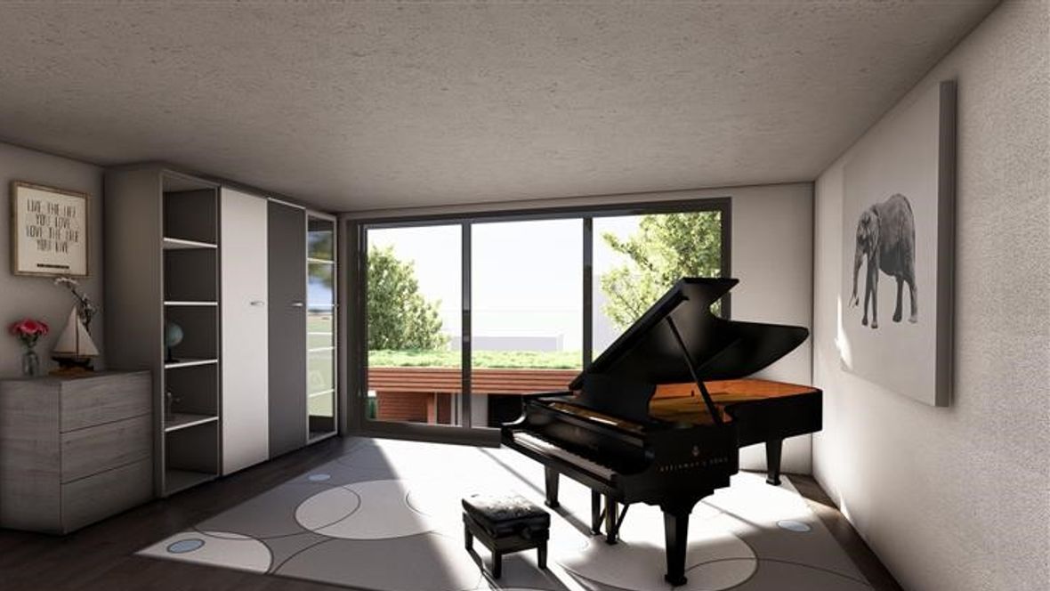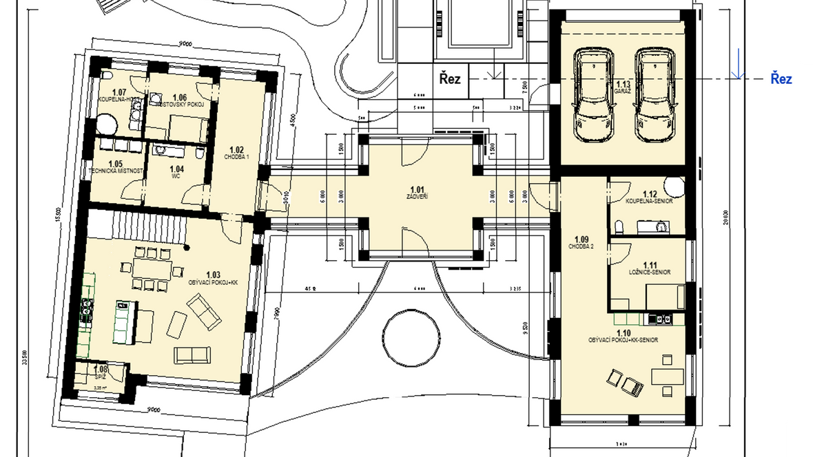 V 1 NP se v první části nachází bezbariérová obytná jednotka pro prarodiče, vybavená koupelnou, ložnicí a obývacím pokojem s KK. V této časti stavby se také nachází garáž se dvěma střešními okny. Ve hlavní části se nachází pokoj pro hosty s koupelnou, obývací pokoj, jídelna, kuchyň, technická místnost, WC, technická místnost, schodiště do 2NP a spíž. V 1NP mimo objekt v zadní části pozemku je umístěna zimní zahrada a skladovací místnost a v přední části, v předzahrádce, je umístěno venkovní sezení pro deset osob. V 2 NP se nachází knihovna a klavír, ložnice, vybavená soukromou koupelnou a šatnou a dětský pokoj s vlastní koupelnou.