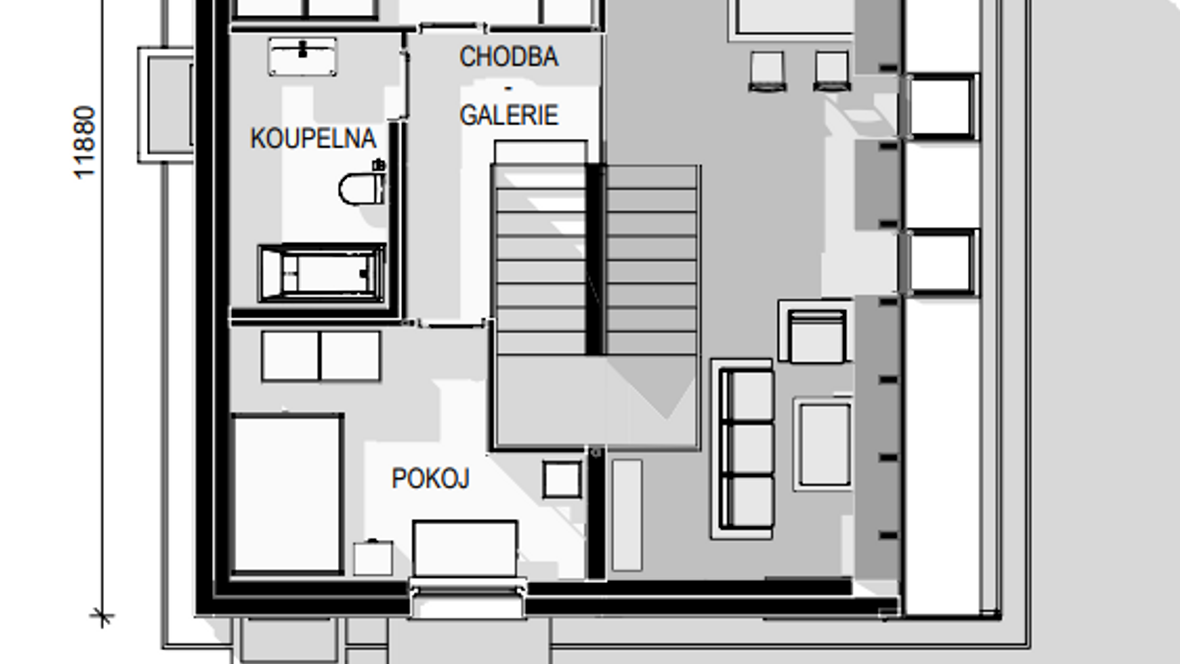 Rodinný dům Gallery je zděný, částečně podsklepený dům s obytným podkrovím. Vstup do objektu je přes zádveří do chodby, ze které jsou přístupné jednotlivé místnosti přízemí a zároveň vstup do suterénu. Dispozici přízemí tvoří technická místnost, koupelna a kuchyň propojená s obývacím pokojem. Přístup do podkroví je po schodišti, které je součástí obývacího pokoje na chodbu, která je otevřená do obývacího pokoje formou galerie. Místnosti podkroví tvoří ložnice, koupelna a dětský pokoj. Součástí projektu je prostorná zahrada s terasou, která je přístupná z obývacího pokoje a kuchyně.