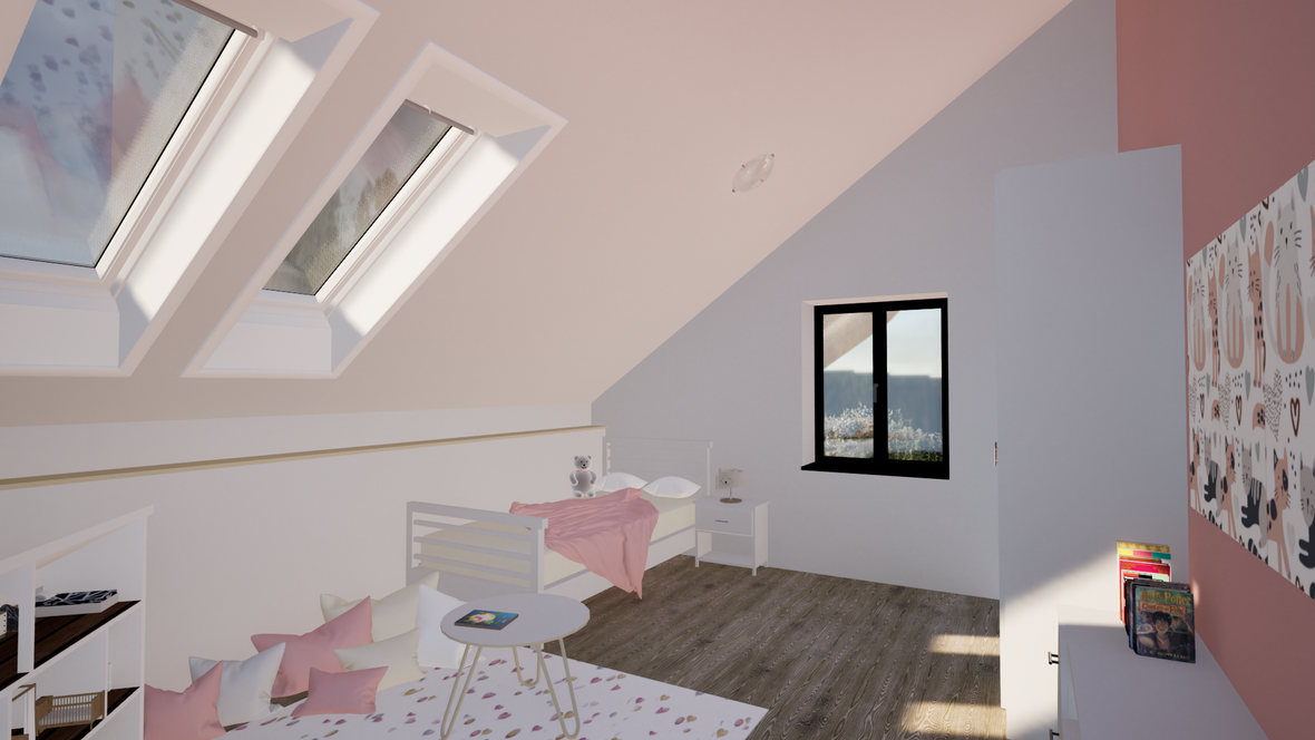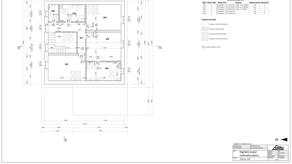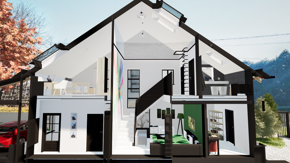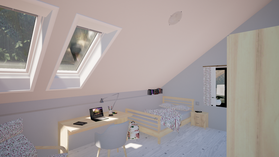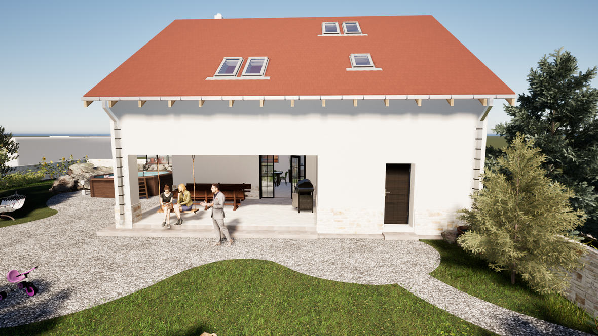 Předmětem projektu je nepodsklepený dvoupodlažní rodinný dům s obytným podkrovím. Hlavní vchod do RD je orientován ze severní strany domu, stejně jako vjezd do garáže. V 1NP je umístěn obývací pokoj s kuchyní, garáž, technická místnost s plynovým kotlem, WC, zádveří, chodba. Kuchyň je propojena s venkovní terasou, která je ideálním prostorem pro letní posezení. Do 2.NP se dostaneme přes obývací pokoj po schodišti. V 2.NP se nachází ložnice se soukromou koupelnou, dva dětské pokoje se sdílenou koupelnou a WC.