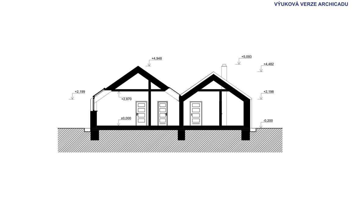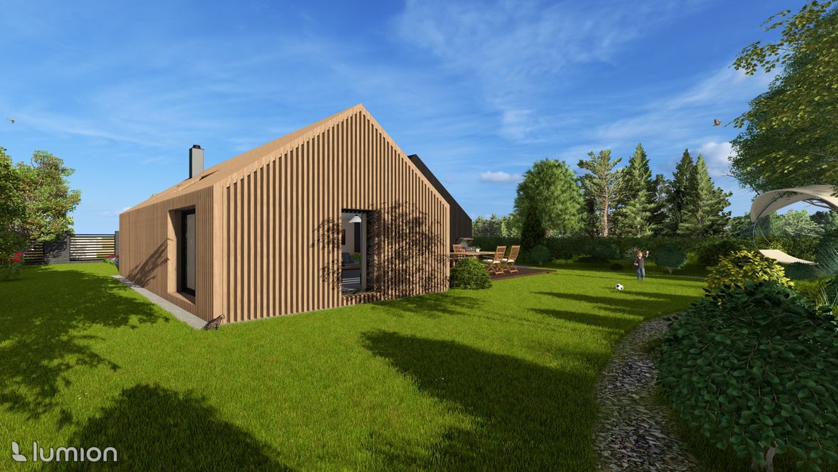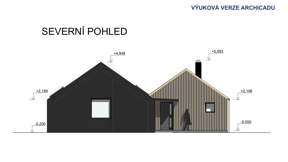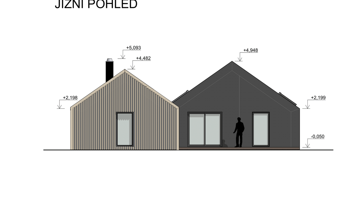 Rodinný dům je navržen na základě spojení dvou podobných hmot se sedlovou střechou, kde v každé z nich se odehrává něco jiného. Jedna část je spíše soukromá s pokoji a koupelnou, druhá je určena pro společenský život. Tento fakt je i podložen dvěma rozdílnými druhy fasád, tmavší hliníkovou a světlejší dřevěnou. Tato kombinace vytváří kontrast. U domu v zadní části se nachází prostorná terasa, na kterou je přístup jak z obývací místnosti, tak ze dvou přiléhajících pokojů. Pocit kontaktu s přírodou dodává zahrada s okrasnou zelení. Průchod denního světla do vnitřních prostor umožňují velká okna v kombinaci se střešními okny Velux GGL a lomenou sestavou Velux GGL + VFE.