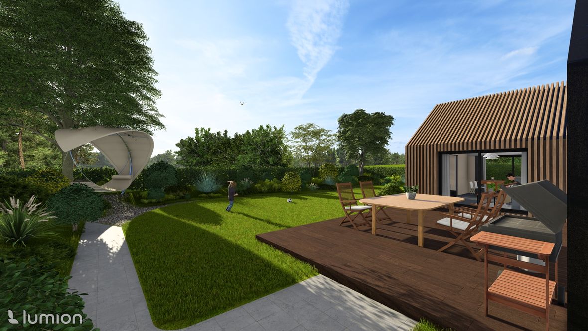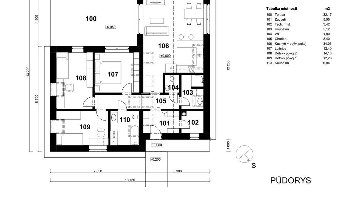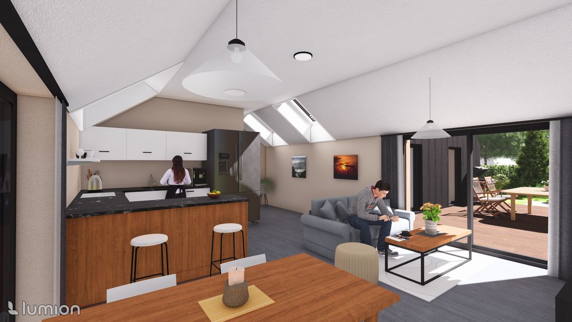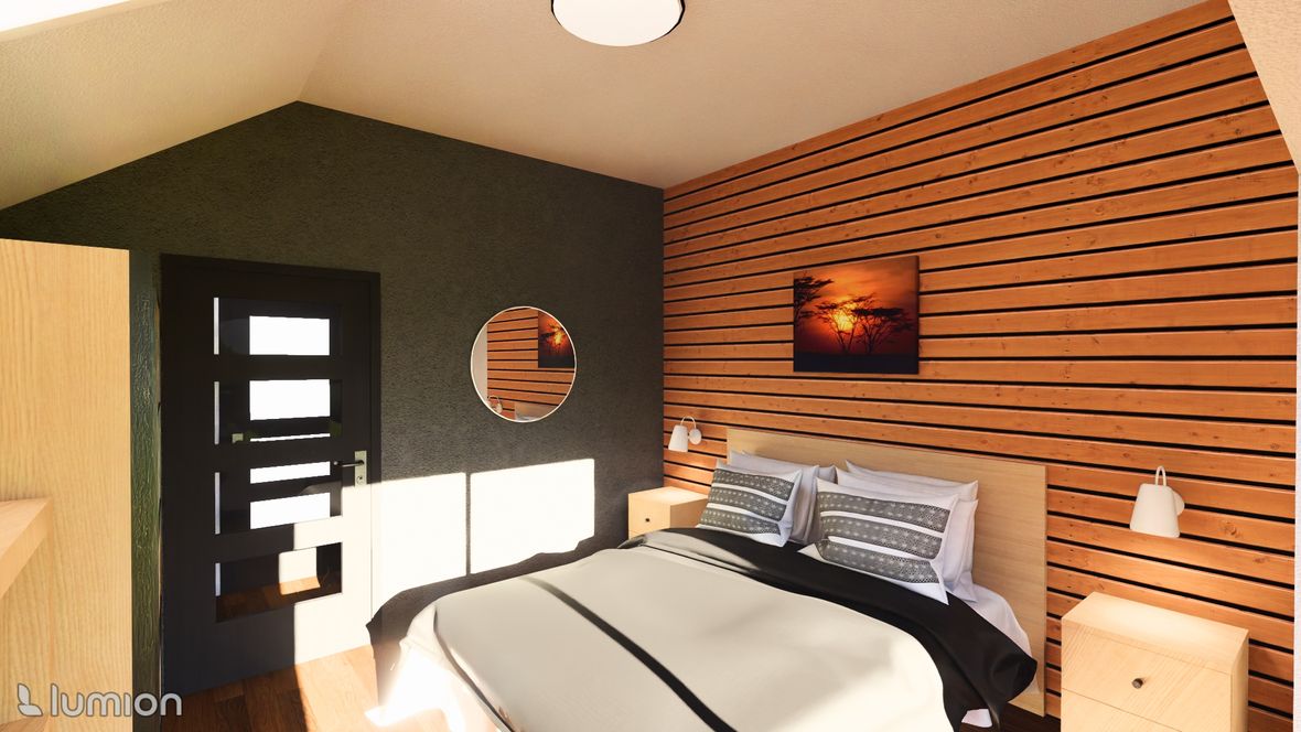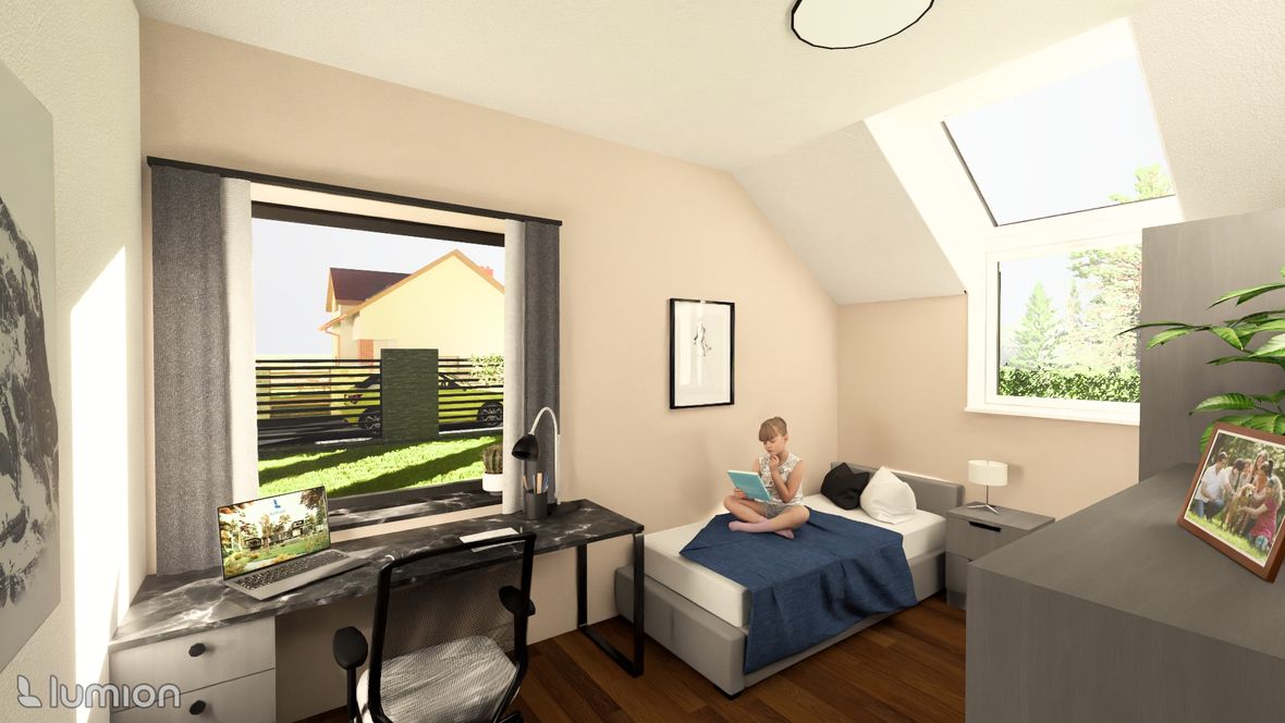Rodinný dům je navržen na základě spojení dvou podobných hmot se sedlovou střechou, kde v každé z nich se odehrává něco jiného. Jedna část je spíše soukromá s pokoji a koupelnou, druhá je určena pro společenský život. Tento fakt je i podložen dvěma rozdílnými druhy fasád, tmavší hliníkovou a světlejší dřevěnou. Tato kombinace vytváří kontrast. U domu v zadní části se nachází prostorná terasa, na kterou je přístup jak z obývací místnosti, tak ze dvou přiléhajících pokojů. Pocit kontaktu s přírodou dodává zahrada s okrasnou zelení. Průchod denního světla do vnitřních prostor umožňují velká okna v kombinaci se střešními okny Velux GGL a lomenou sestavou Velux GGL + VFE.