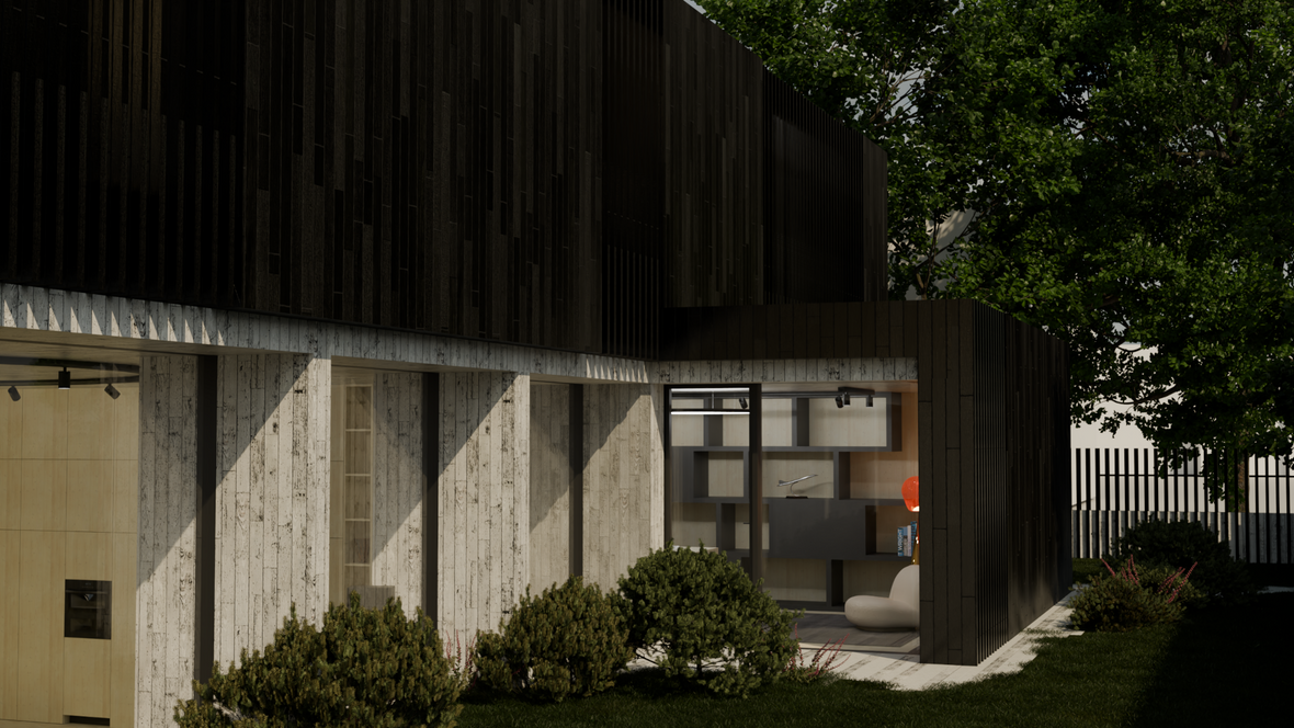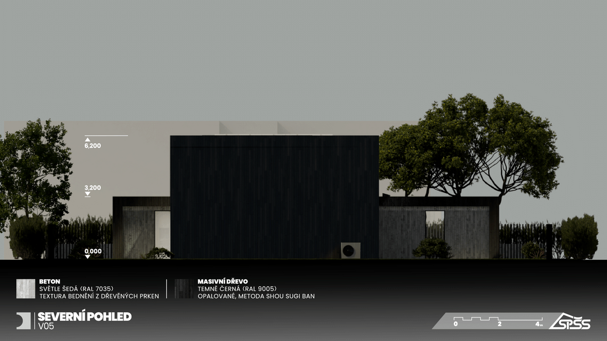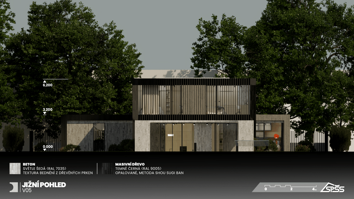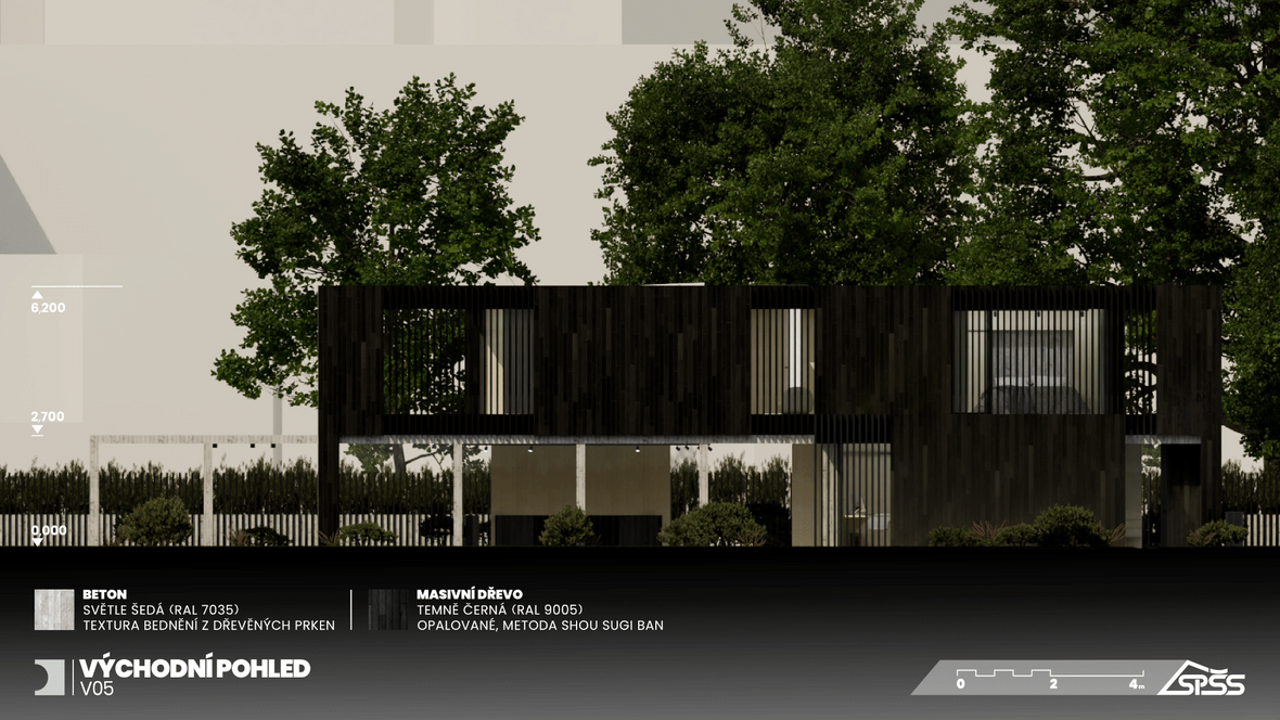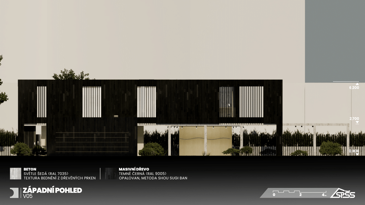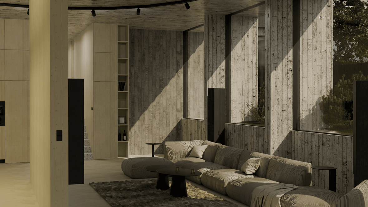 Bez vývoje není budoucnost. Studie rodinného domu propojuje materiál, prostor i funkci do jednoho souvislého celku. Pohledový beton ukotvuje stavbu v prostředí, zatímco horní patro z opalovaného dřeva jí dodává lehkost a přirozeně propojuje dům s okolní krajinou. Dřevěné prvky plynule prostupují interiérem a vedou obyvatele napříč prostorem, čímž vytvářejí přirozenou návaznost mezi vnějším a vnitřním světem. Dům je navržen jako dynamická součást života – společenské prostory se otevírají a propojují s exteriérem, zatímco soukromé zóny si zachovávají intimitu. Světlo, materiál a prostor zde nejsou izolované prvky, ale vrstvy jednoho celku, kde jednotlivé části neoddělují, ale plynule přecházejí jedna v druhou.