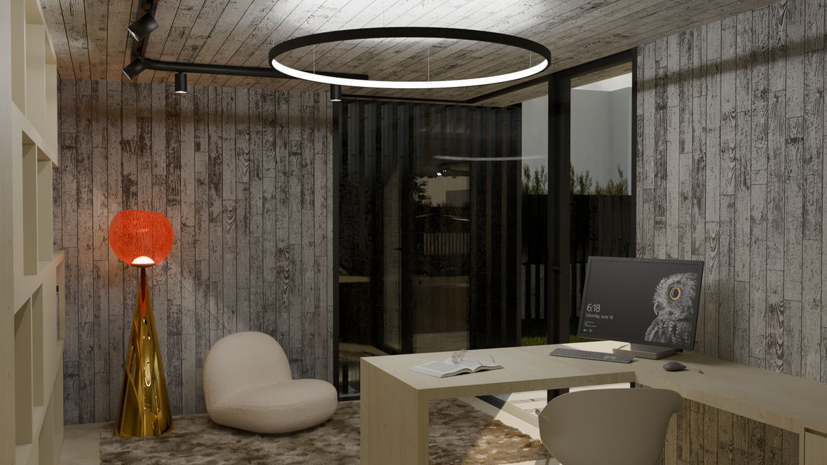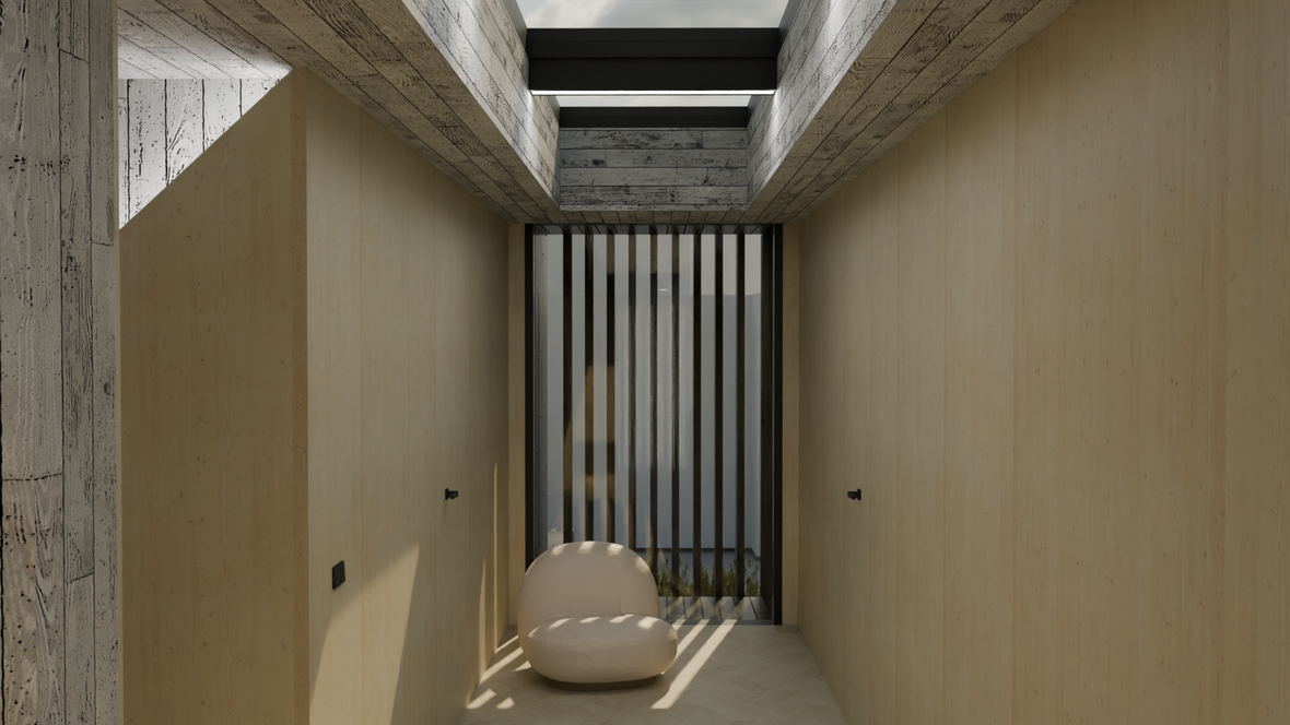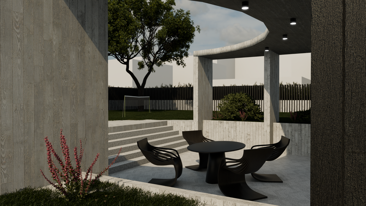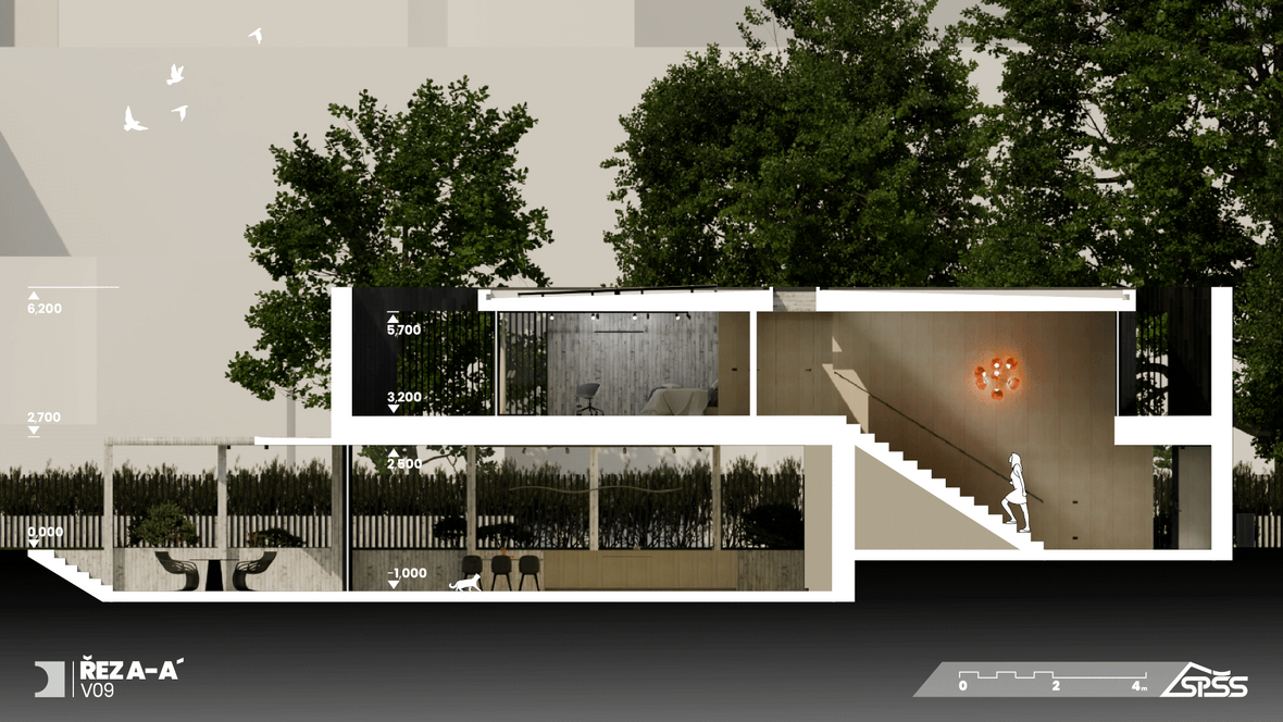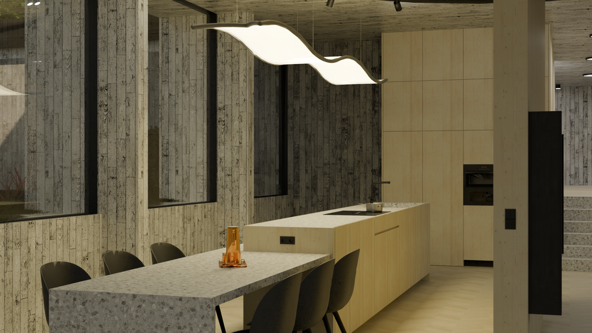 Bez vývoje není budoucnost. Studie rodinného domu propojuje materiál, prostor i funkci do jednoho souvislého celku. Pohledový beton ukotvuje stavbu v prostředí, zatímco horní patro z opalovaného dřeva jí dodává lehkost a přirozeně propojuje dům s okolní krajinou. Dřevěné prvky plynule prostupují interiérem a vedou obyvatele napříč prostorem, čímž vytvářejí přirozenou návaznost mezi vnějším a vnitřním světem. Dům je navržen jako dynamická součást života – společenské prostory se otevírají a propojují s exteriérem, zatímco soukromé zóny si zachovávají intimitu. Světlo, materiál a prostor zde nejsou izolované prvky, ale vrstvy jednoho celku, kde jednotlivé části neoddělují, ale plynule přecházejí jedna v druhou.