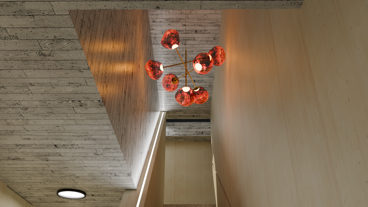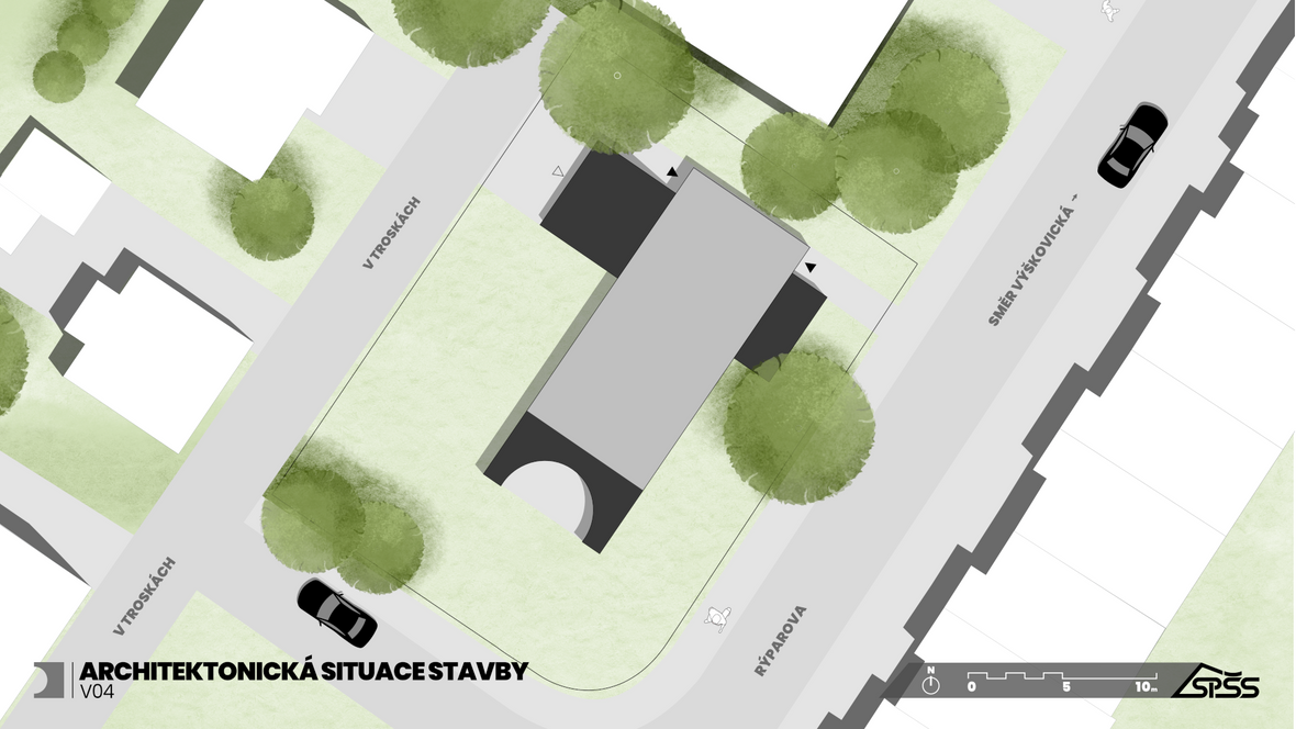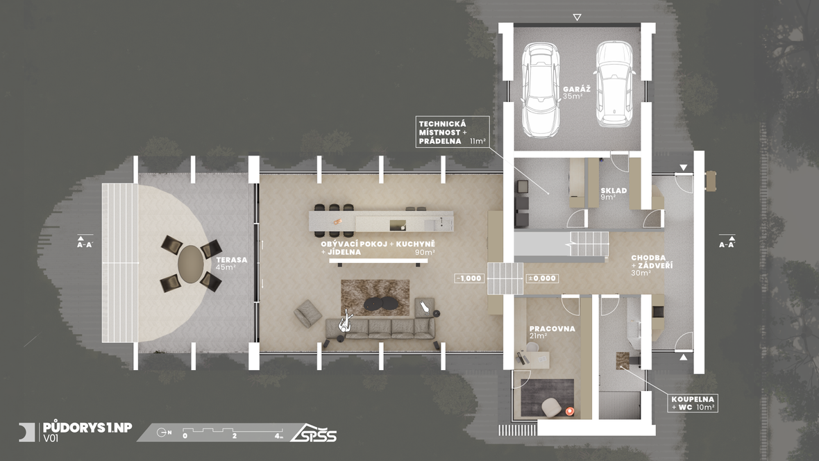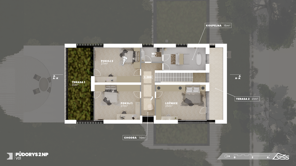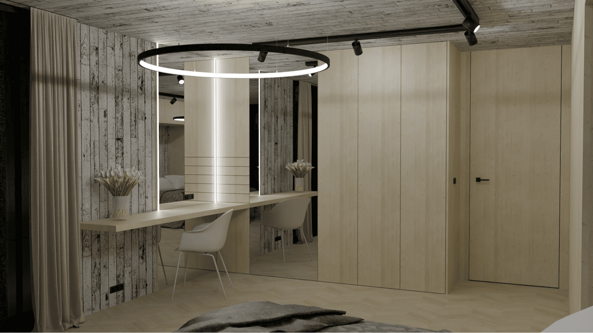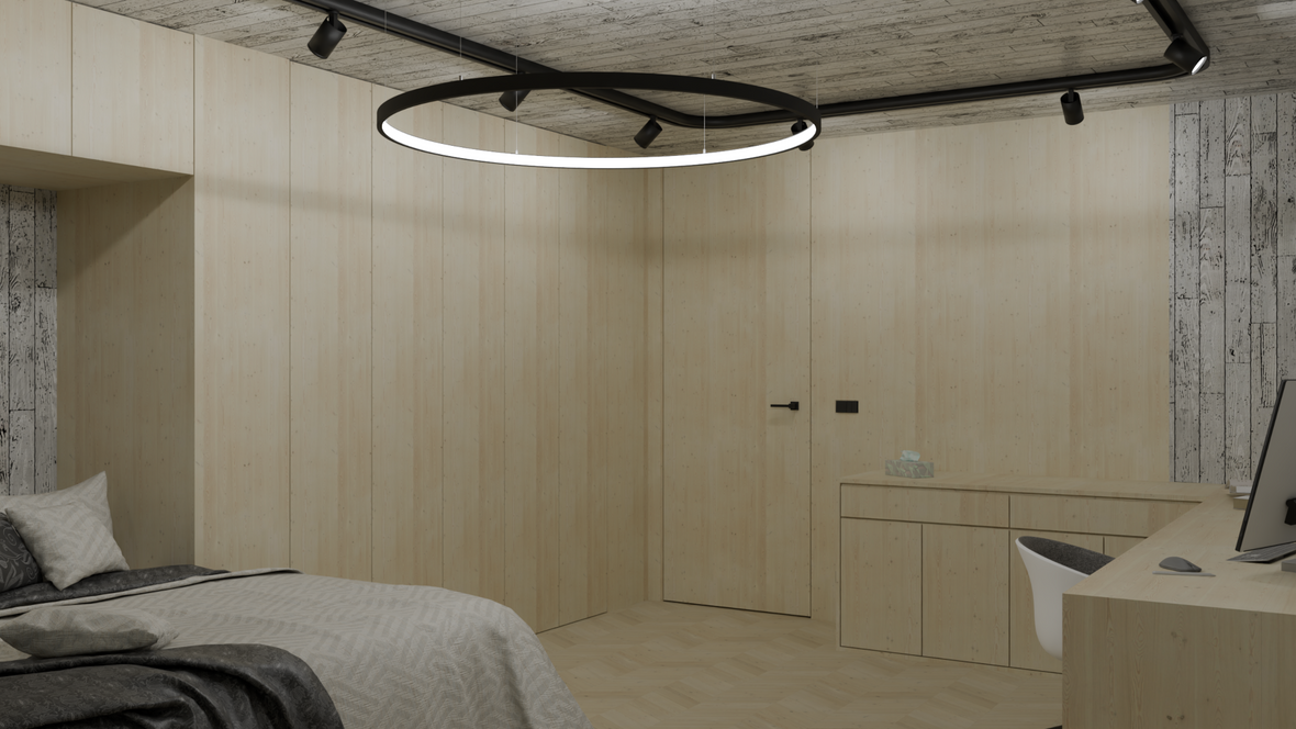 Bez vývoje není budoucnost. Studie rodinného domu propojuje materiál, prostor i funkci do jednoho souvislého celku. Pohledový beton ukotvuje stavbu v prostředí, zatímco horní patro z opalovaného dřeva jí dodává lehkost a přirozeně propojuje dům s okolní krajinou. Dřevěné prvky plynule prostupují interiérem a vedou obyvatele napříč prostorem, čímž vytvářejí přirozenou návaznost mezi vnějším a vnitřním světem. Dům je navržen jako dynamická součást života – společenské prostory se otevírají a propojují s exteriérem, zatímco soukromé zóny si zachovávají intimitu. Světlo, materiál a prostor zde nejsou izolované prvky, ale vrstvy jednoho celku, kde jednotlivé části neoddělují, ale plynule přecházejí jedna v druhou.
