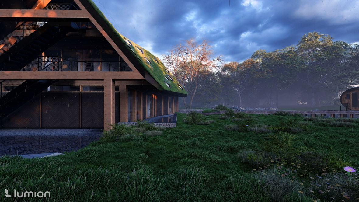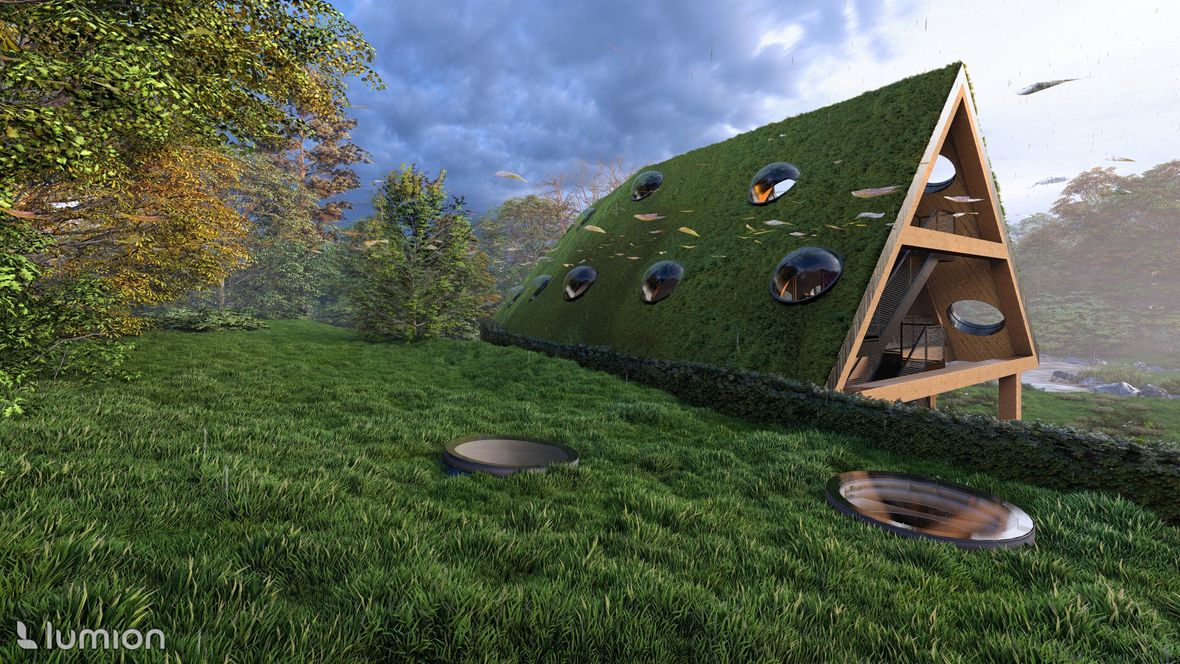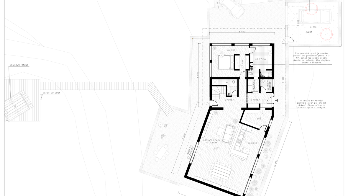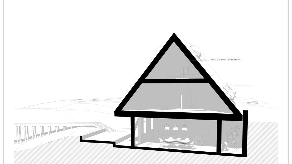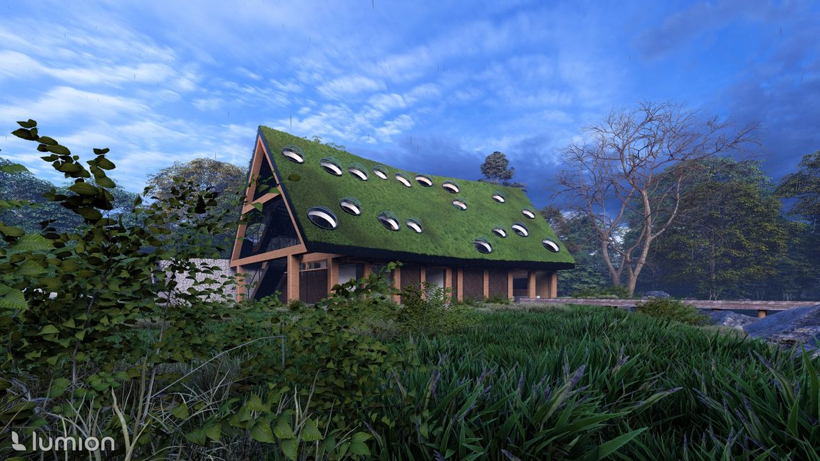 Rodinný dům U Tiché sauny je útočištěm klidu a promyšleného bydlení v objetí přírody. Nachází se na kraji lesa u rybníka, kde citlivě zapadá do krajiny díky své dřevěné konstrukci ve tvaru A a zelené střeše, která přirozeně splývá s okolní loukou i svažitým terénem. Dům je výsledkem respektu k přírodě – použité dřevo pochází přímo z místních lesů, čímž se minimalizoval ekologický dopad a podpořily se lokální zdroje a řemeslníci. Stavba se obejde bez razantních zásahů do terénu – minimální odkop zeminy, přírodní materiály jako kámen a dřevo, a důmyslné začlenění do svahu vytvářejí harmonii mezi lidským obydlím a krajinou. Uvnitř se dům dělí do funkčních zón, které reflektují chytré myšlení i každodenní pohodlí. Zádveří plynule navazuje na spíž skrze praktický otvor, takže nákupy se ukládají jednoduše a bez zbytečných kroků. Vertikální propojení koupelen umožňuje přímý přesun prádla do prádelny pomocí vestavěné trubky. Dominantou interiéru je prosvětlený obývací prostor s vysokým stropem, kde kruhová okna vpouští měkké denní světlo a propojují vnitřní prostor s přírodou. Součástí domu je také intimní sauna, která doplňuje celkovou filozofii pomalého života, relaxace a návratu ke kořenům. Rodinný dům U Tiché sauny není jen místem k bydlení – je to životní styl, který ctí krajinu, přirozenost a rovnováhu.