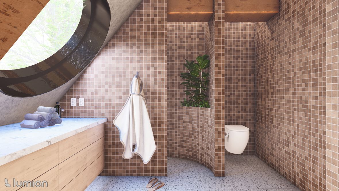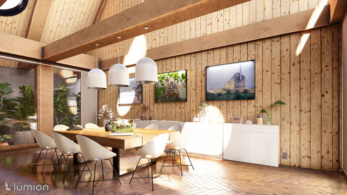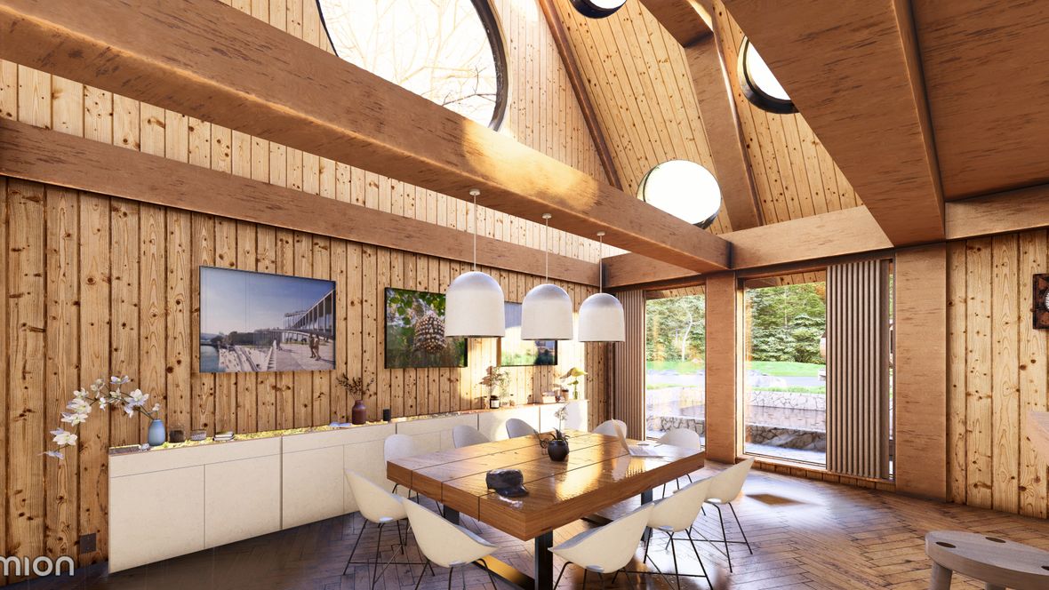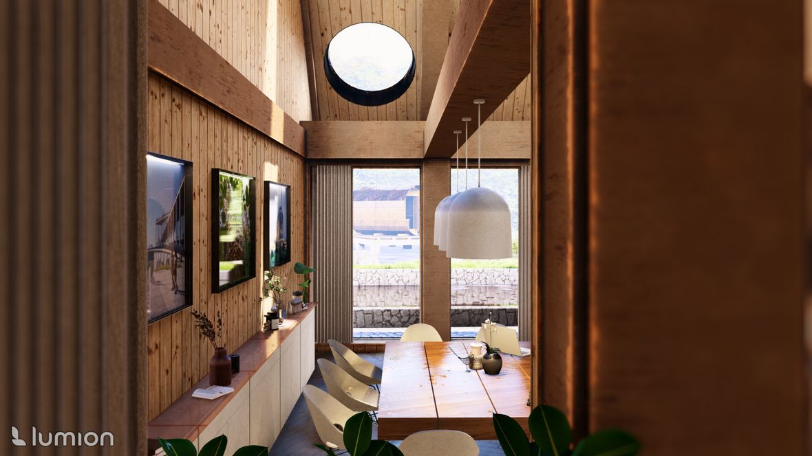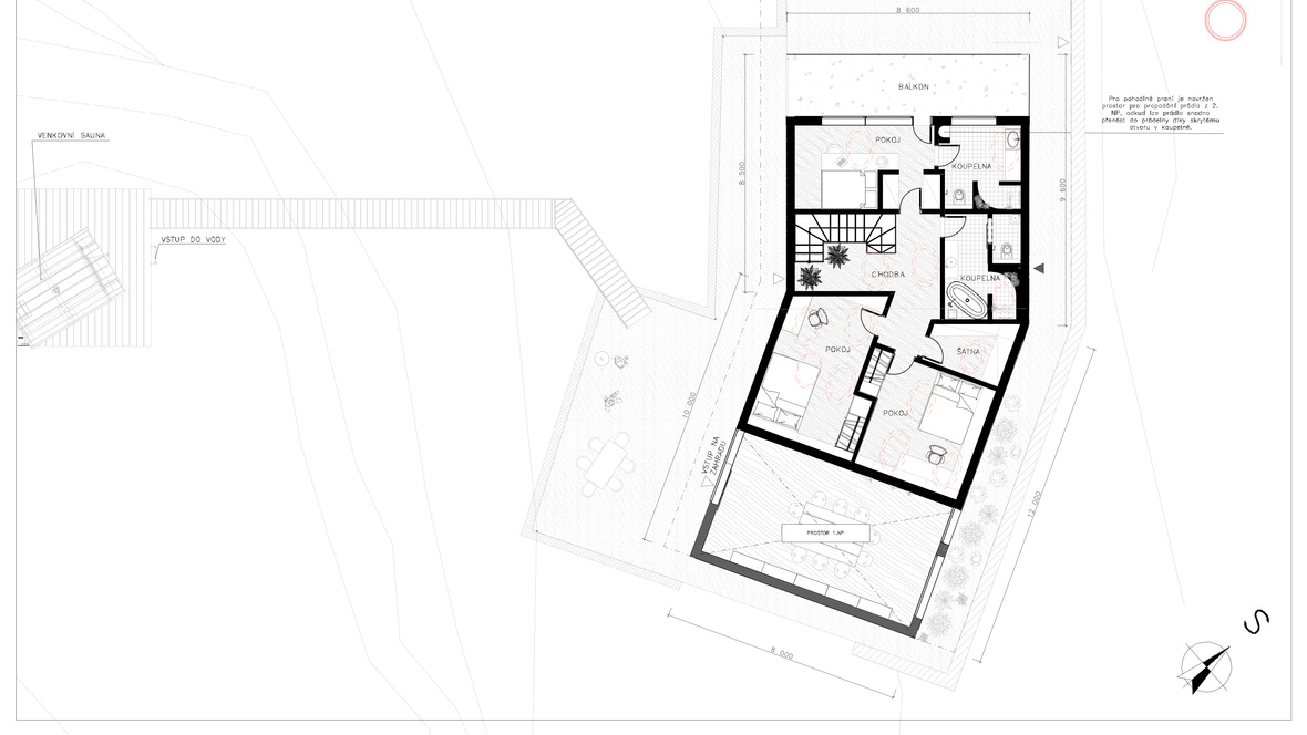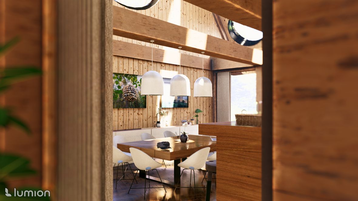 Rodinný dům U Tiché sauny je útočištěm klidu a promyšleného bydlení v objetí přírody. Nachází se na kraji lesa u rybníka, kde citlivě zapadá do krajiny díky své dřevěné konstrukci ve tvaru A a zelené střeše, která přirozeně splývá s okolní loukou i svažitým terénem. Dům je výsledkem respektu k přírodě – použité dřevo pochází přímo z místních lesů, čímž se minimalizoval ekologický dopad a podpořily se lokální zdroje a řemeslníci. Stavba se obejde bez razantních zásahů do terénu – minimální odkop zeminy, přírodní materiály jako kámen a dřevo, a důmyslné začlenění do svahu vytvářejí harmonii mezi lidským obydlím a krajinou. Uvnitř se dům dělí do funkčních zón, které reflektují chytré myšlení i každodenní pohodlí. Zádveří plynule navazuje na spíž skrze praktický otvor, takže nákupy se ukládají jednoduše a bez zbytečných kroků. Vertikální propojení koupelen umožňuje přímý přesun prádla do prádelny pomocí vestavěné trubky. Dominantou interiéru je prosvětlený obývací prostor s vysokým stropem, kde kruhová okna vpouští měkké denní světlo a propojují vnitřní prostor s přírodou. Součástí domu je také intimní sauna, která doplňuje celkovou filozofii pomalého života, relaxace a návratu ke kořenům. Rodinný dům U Tiché sauny není jen místem k bydlení – je to životní styl, který ctí krajinu, přirozenost a rovnováhu.