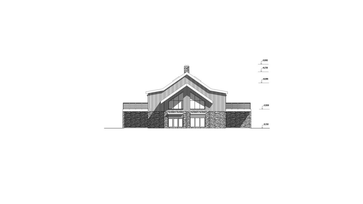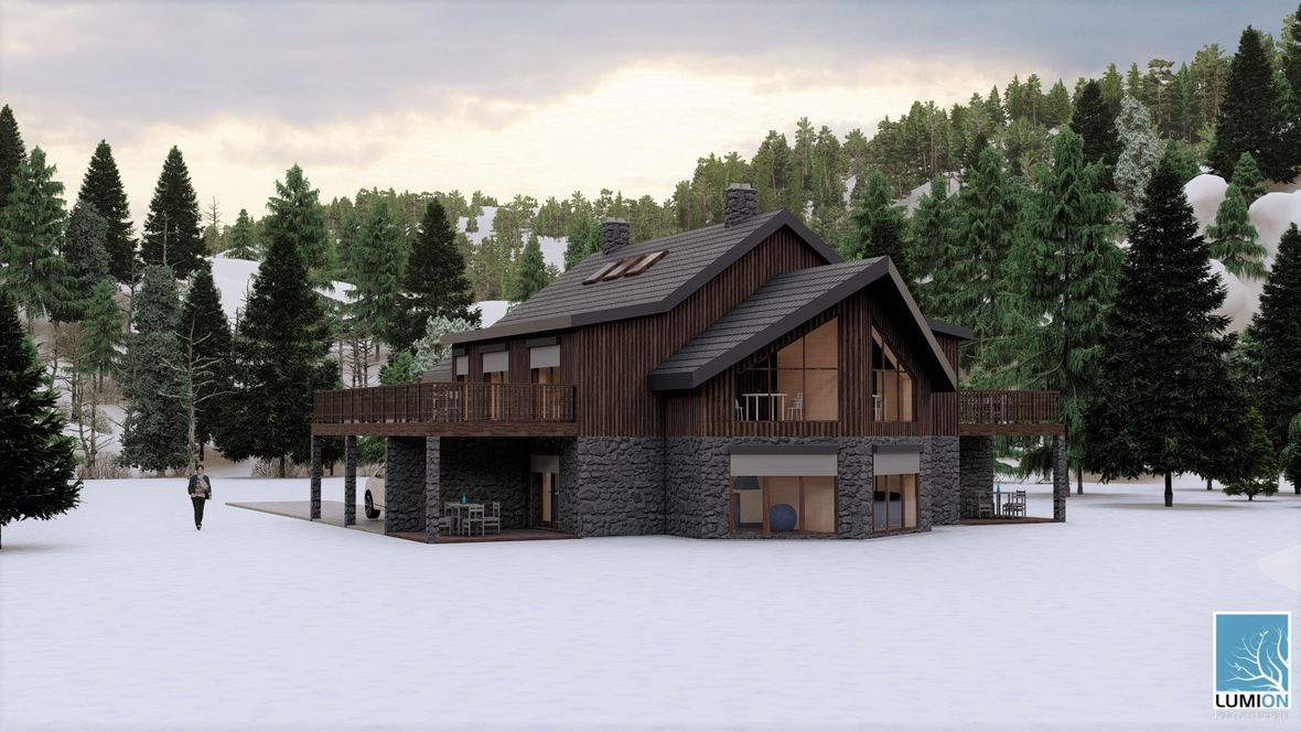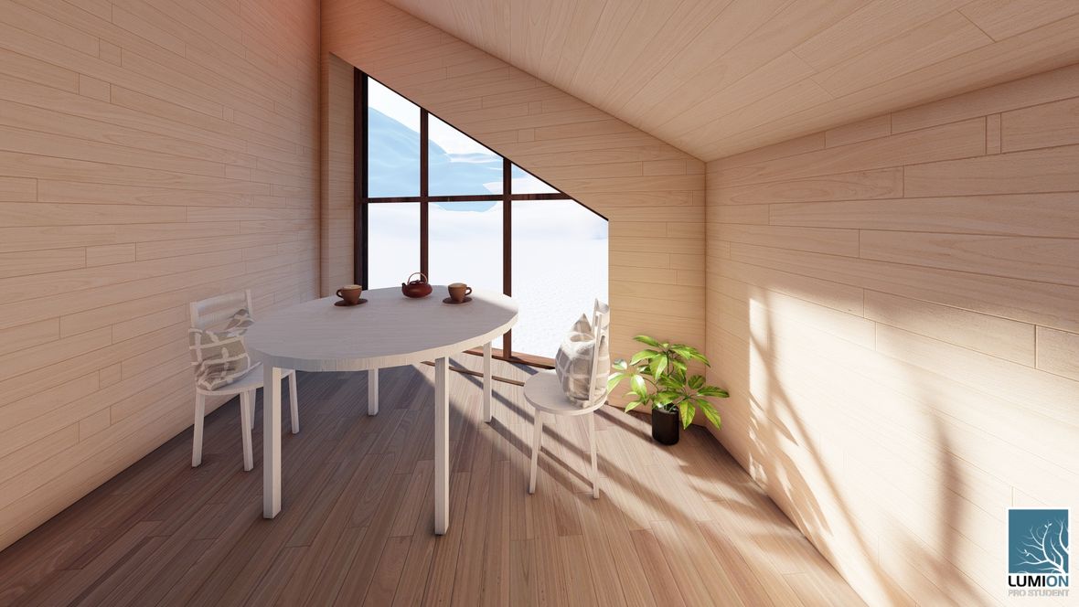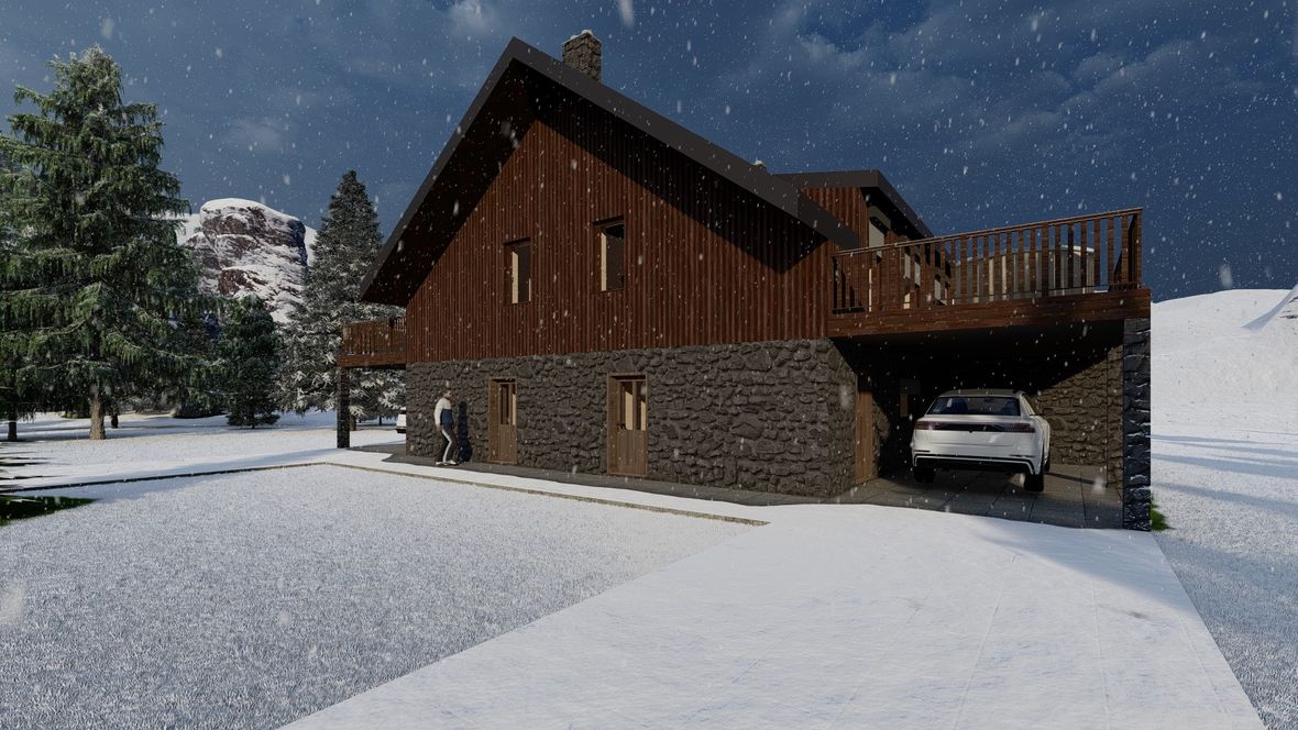 Horská chata Amundsen je dvoupodlažní objekt, rozdělený středovou nosnou zdí na dvě symetrické části. Nabízí dva od sebe oddělené apartmány, určené pro čtyřčlenné rodiny. V 1. nadzemním podlaží se nachází společenská místnost, zakončená šikmou zdí s řadou francouzských oken umožňujících prosvětlení celé místnosti, na tu navazuje jídelna s kuchyní a přístupem na terasu. Na severní straně najdeme vchod se zádveřím s možností přístupu do šatny (možno využít také jako lyžárnu). Šatna je propojena dveřmi s krytým stáním pro auta v exteriéru. Středem chaty vede chodba a schody lemující středovou zeď, vedoucí do 2. nadzemního podlaží. V 2. NP se nachází pokoje a koupelna se vstupem na velkou společnou terasu , s výhledem na okolní krajinu. HLAVNÍ MYŠLENKA: Záměrem bylo vytvořit horskou chatu, symetricky oddělenou na dvě části, s cílem rekreace a odpočinku. Snažila jsem se použít přírodní materiály, kontrast dřeva a kamene v souznění s přírodou.