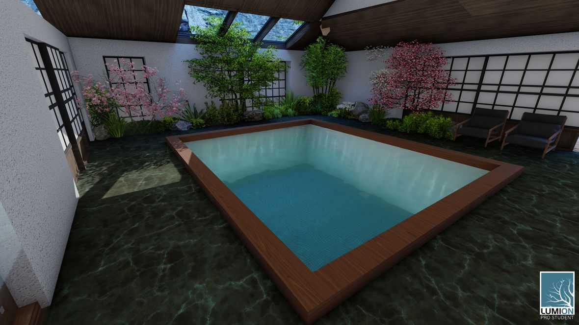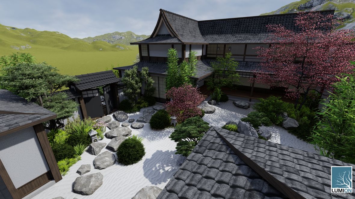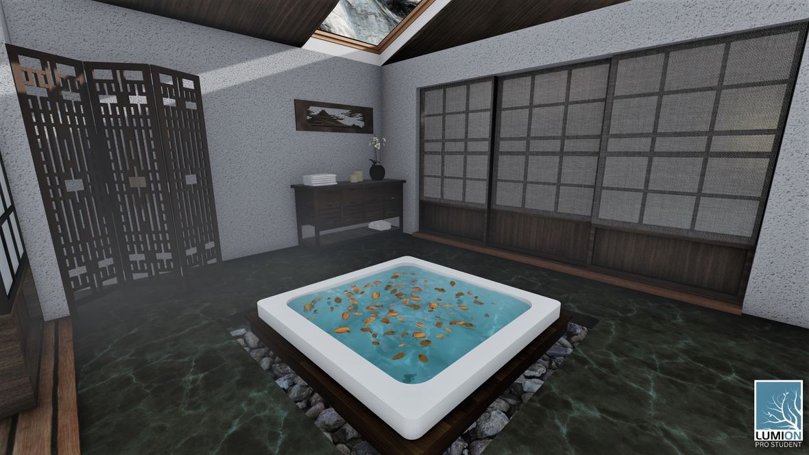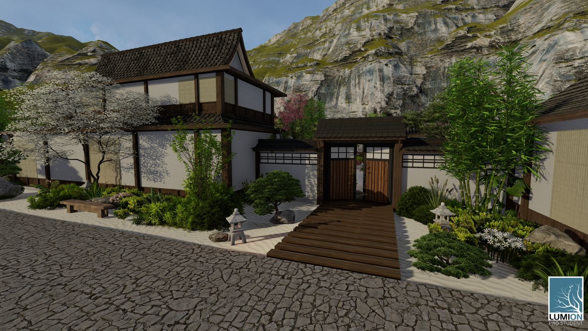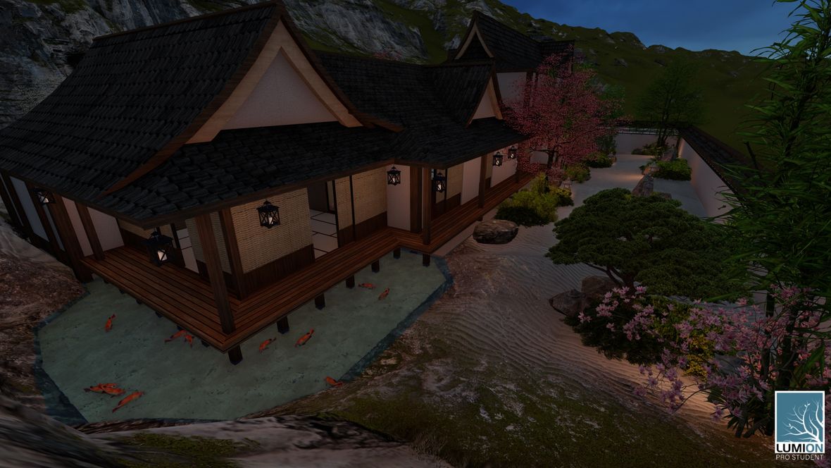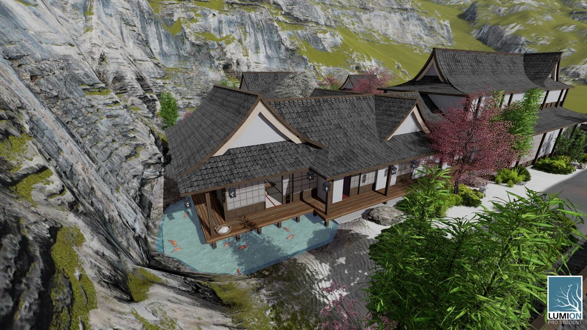 Vila se nachází v horském prostředí. Je navržena v japonském stylu s klasickou japonskou střechou. Je určena pro více člennou rodinu. Skládá se ze tří budov a to z garáže, obytné části a uzavřeného bazénu s lázněmi a horkými prameny. Bazén a lázně jsou doplněny střešními okny, aby dovnitř pronikalo více slunečního světla. Obytná část se skládá ze dvou podlaží. V 1.NP se nachází vstupní hala se šatnou a WC, prádelna, obývací pokoj, pracovna s knihovnou, relaxační místnost, kuchyně s jídelnou a ložnice se šatnou a koupelnou. V 2. NP najdeme dvě ložnice se samostatnou šatnou a koupelnou. Vila je převážně z betonu s dřevěnými detaily a sloupky doplněna o velká mřížkovaná okna.