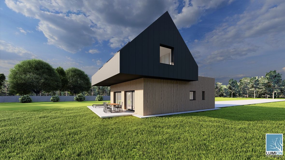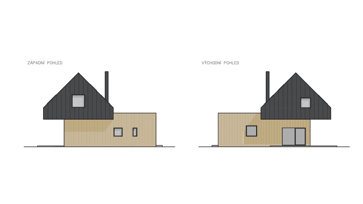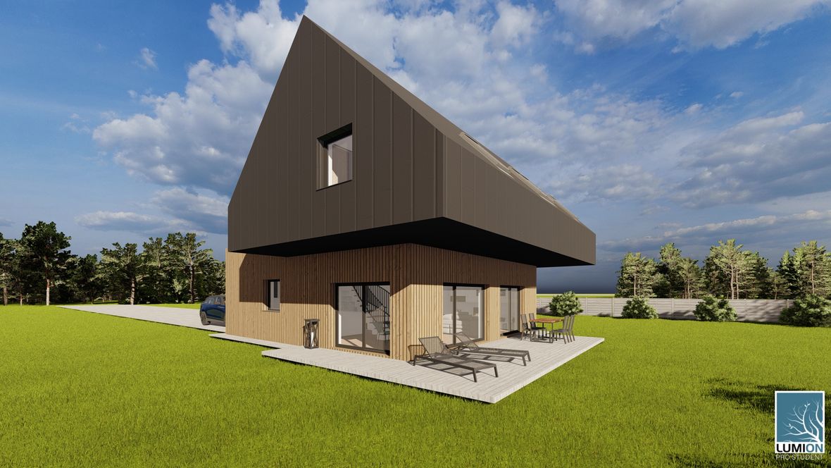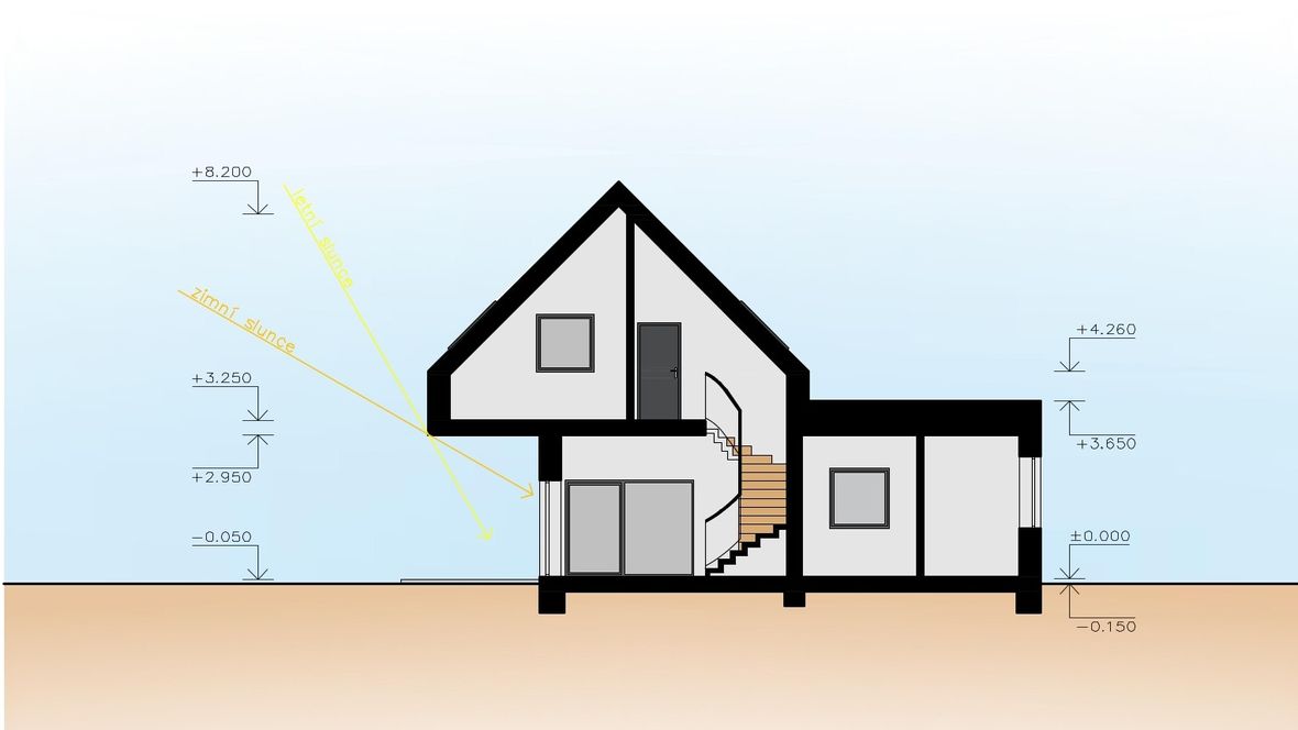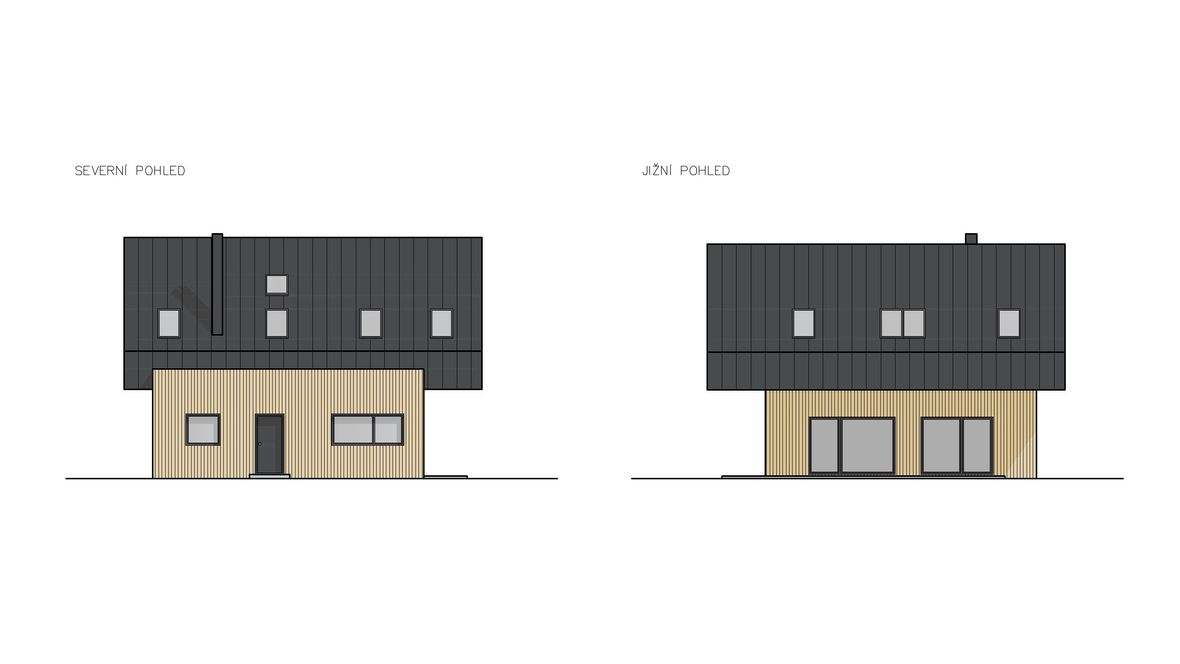 HLAVNÍ MYŠLENKA: Mým hlavním cílem bylo vytvořit ideální rodinný dům pro čtyřčlennou rodinu. Snažila jsem se dům ozvláštnit neobvyklým předsunutím druhého podlaží, které zároveň slouží jako krytí pro venkovní terasu. DISPOZIČNÍ ŘEŠENÍ: Objekt disponuje dvěma nadzemními podlažími. První podlaží má funkci společenskou. Nachází se zde obývací pokoj propojený s kuchyní, pracovna, sociální zařízení, technická místnost a zádveří spojené se šatnou. Z obývacího pokoje je přímý vstup na prostornou terasu. V obývacím pokoji se také nachází schodiště, které obyvatele dovede do druhého podlaží. Toto podlaží má funkci klidovou. Nachází se zde prostorná šatna, sociální zařízení, dva dětské pokoje a ložnice propojena se samostatným sociálním zařízením. Všechny místnosti jsou prosvětleny střešními okny, které budou opatřeny venkovními roletami. MATERIÁLOVÉ ŘEŠENÍ: Vnější plášť prvního podlaží je proveden z přírodního dřeva. Střecha a vnější plášť druhého podlaží jsou chráněny hladkým trapézovým plechem, který s přírodním dřevem vytváří zajímavý kontrast.