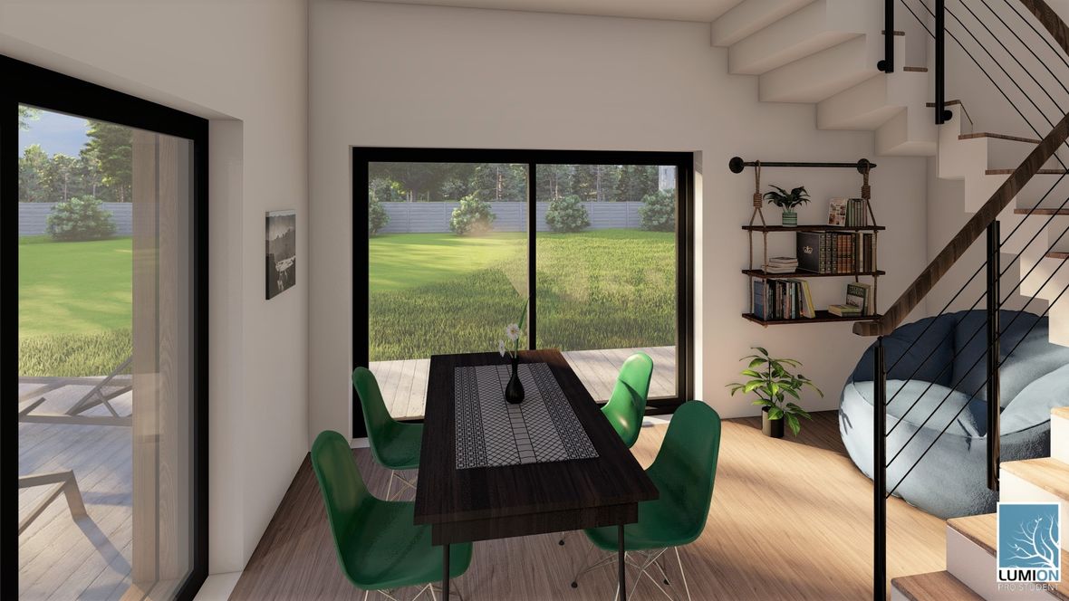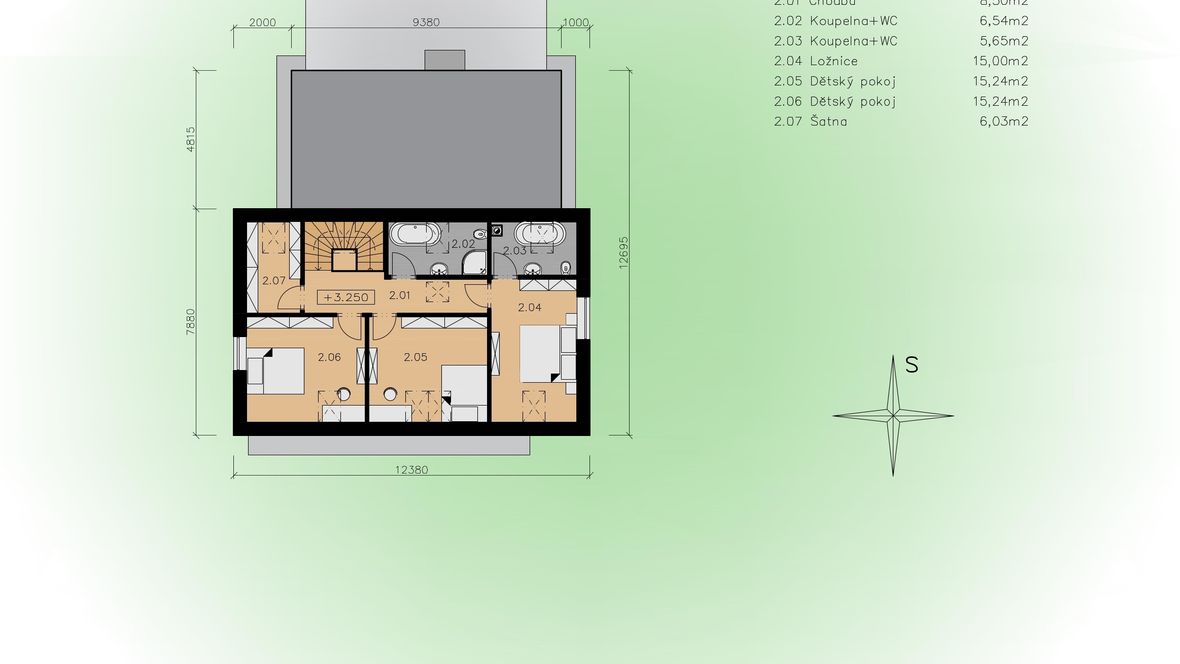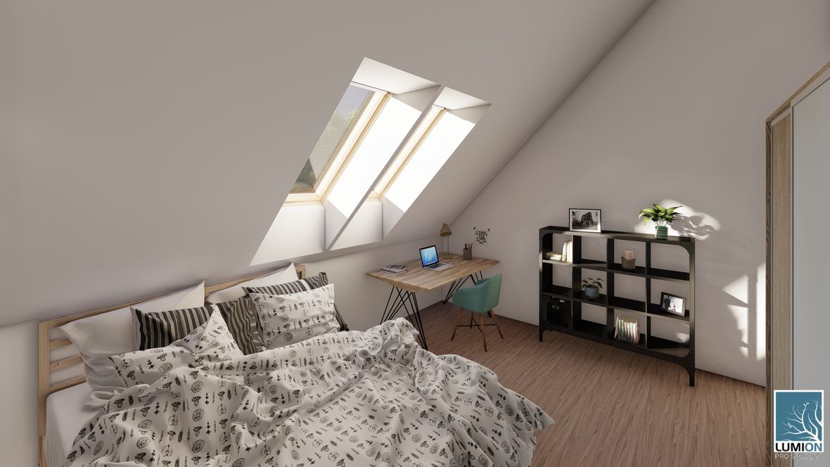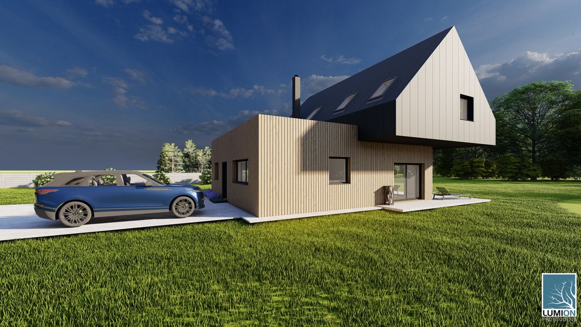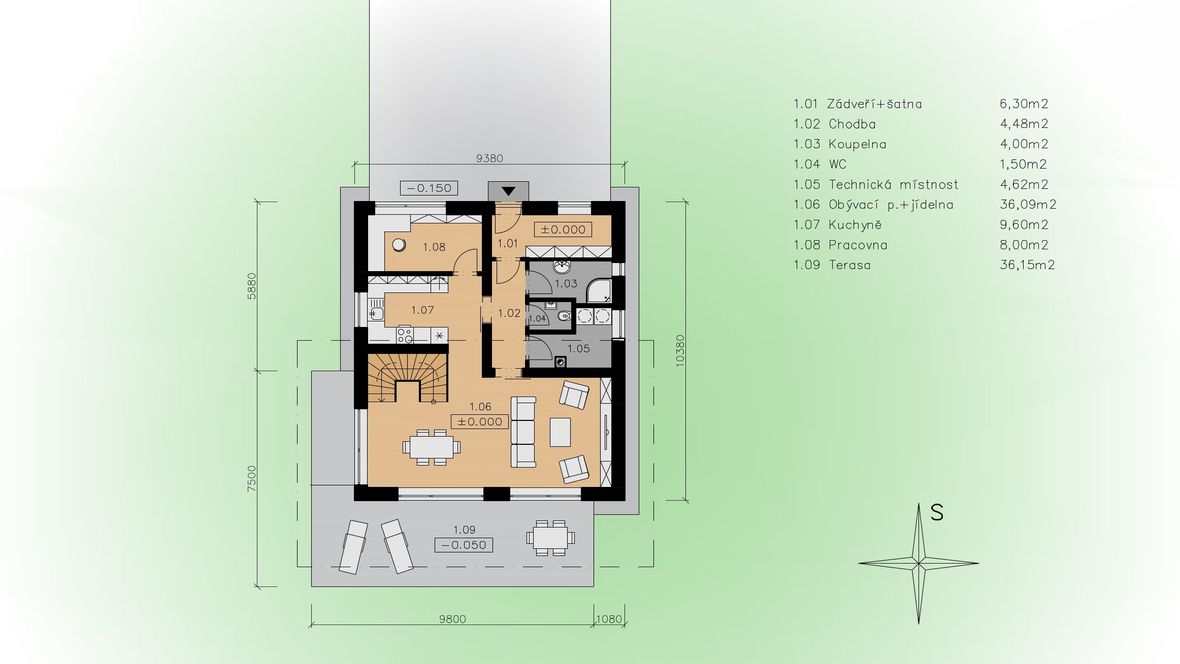 HLAVNÍ MYŠLENKA: Mým hlavním cílem bylo vytvořit ideální rodinný dům pro čtyřčlennou rodinu. Snažila jsem se dům ozvláštnit neobvyklým předsunutím druhého podlaží, které zároveň slouží jako krytí pro venkovní terasu. DISPOZIČNÍ ŘEŠENÍ: Objekt disponuje dvěma nadzemními podlažími. První podlaží má funkci společenskou. Nachází se zde obývací pokoj propojený s kuchyní, pracovna, sociální zařízení, technická místnost a zádveří spojené se šatnou. Z obývacího pokoje je přímý vstup na prostornou terasu. V obývacím pokoji se také nachází schodiště, které obyvatele dovede do druhého podlaží. Toto podlaží má funkci klidovou. Nachází se zde prostorná šatna, sociální zařízení, dva dětské pokoje a ložnice propojena se samostatným sociálním zařízením. Všechny místnosti jsou prosvětleny střešními okny, které budou opatřeny venkovními roletami. MATERIÁLOVÉ ŘEŠENÍ: Vnější plášť prvního podlaží je proveden z přírodního dřeva. Střecha a vnější plášť druhého podlaží jsou chráněny hladkým trapézovým plechem, který s přírodním dřevem vytváří zajímavý kontrast.