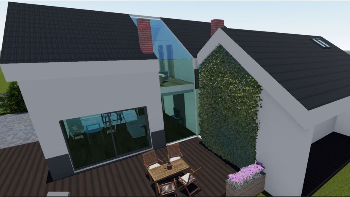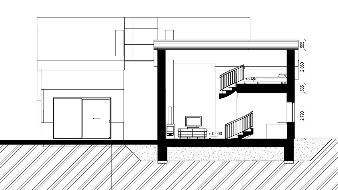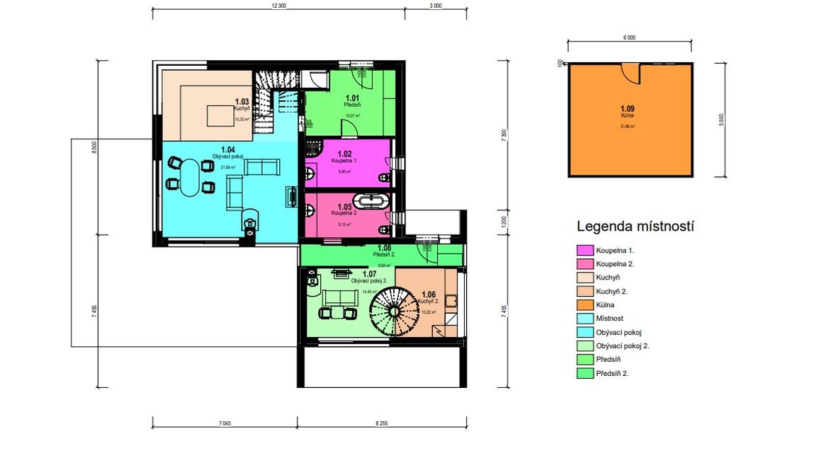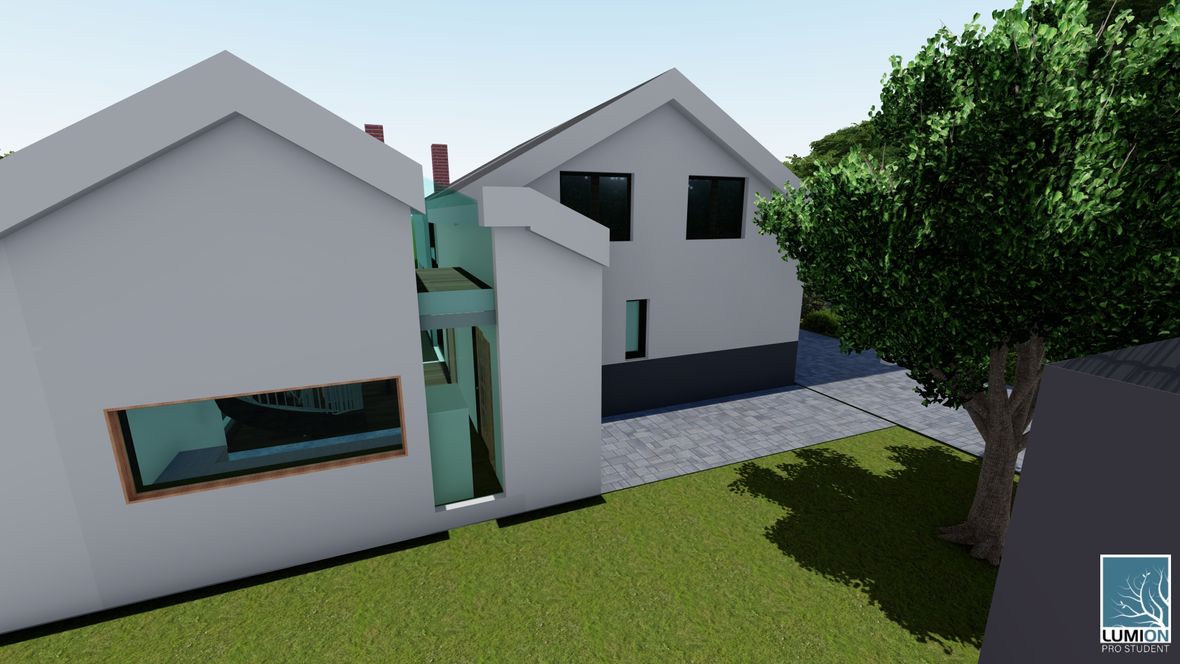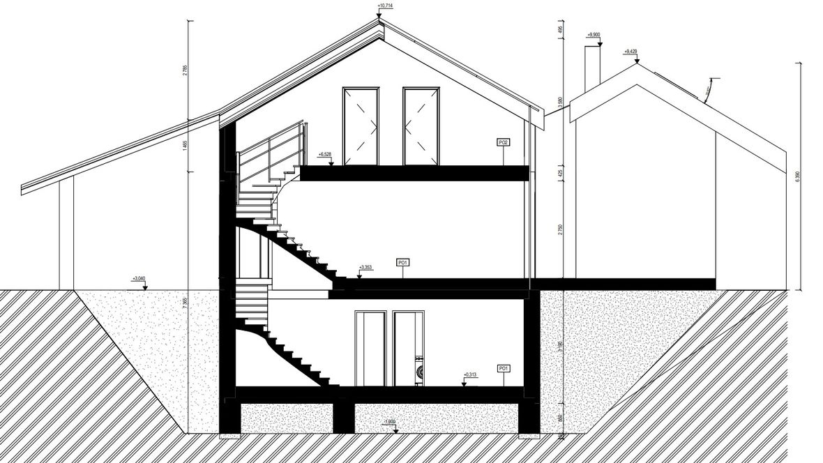 Chci Vám představit dvougenerační dům s částečným podsklepením. V 1.PP najdeme sklad a technickou místnost. V 1.NP se nachází pro každou generaci vlastní KK+ jídelna, obývací pokoj, koupelna a předsíň. V 2.NP v hlavní budově máme druhou koupelnu, ložnici, dětský pokoj a pracovnu. Ve druhé budově máme jen otevřenou ložnici. Hlavním prosvětlujícím prvkem domu je velká prosklená část na boku hlavní budovy a prosklený průhled ve vedlejší budově. Stínění v těchto částech proti nadměrnému slunečnímu záření bude ošetřeno pomocí folie. V 2.NP jsou použita střešní okna Velux GGL s horním ovládáním.