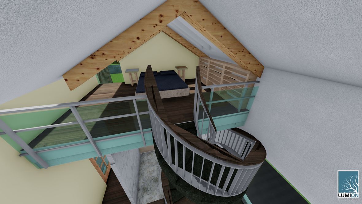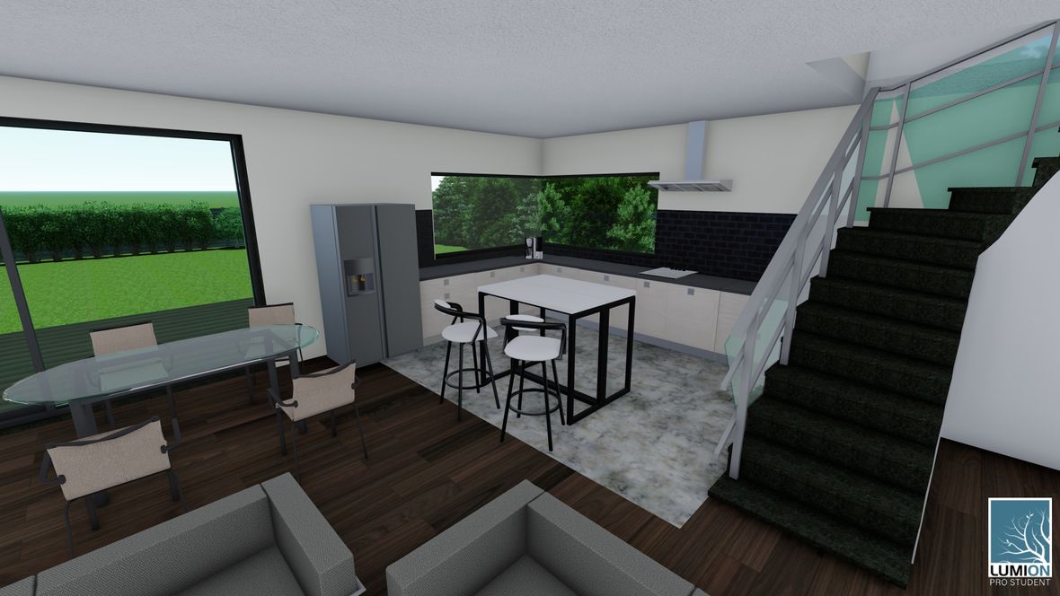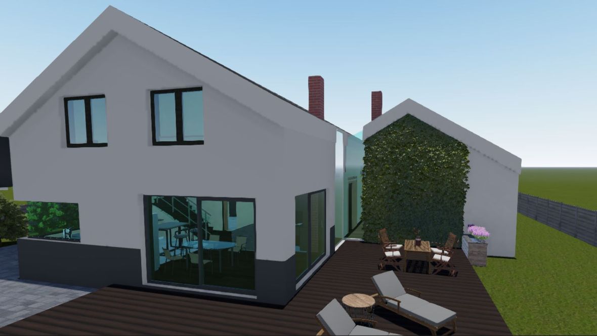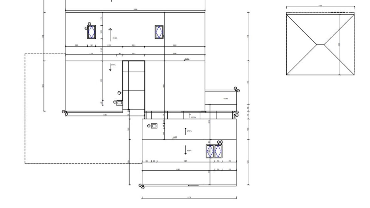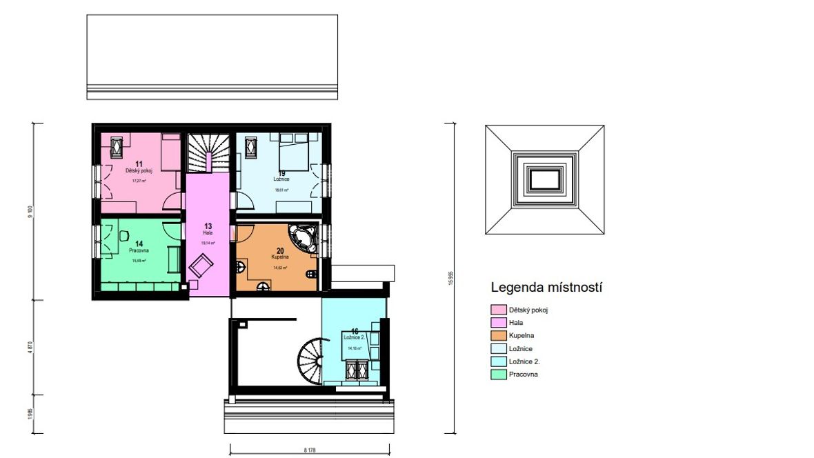 Chci Vám představit dvougenerační dům s částečným podsklepením. V 1.PP najdeme sklad a technickou místnost. V 1.NP se nachází pro každou generaci vlastní KK+ jídelna, obývací pokoj, koupelna a předsíň. V 2.NP v hlavní budově máme druhou koupelnu, ložnici, dětský pokoj a pracovnu. Ve druhé budově máme jen otevřenou ložnici. Hlavním prosvětlujícím prvkem domu je velká prosklená část na boku hlavní budovy a prosklený průhled ve vedlejší budově. Stínění v těchto částech proti nadměrnému slunečnímu záření bude ošetřeno pomocí folie. V 2.NP jsou použita střešní okna Velux GGL s horním ovládáním.