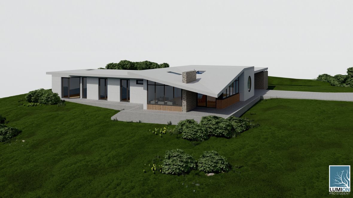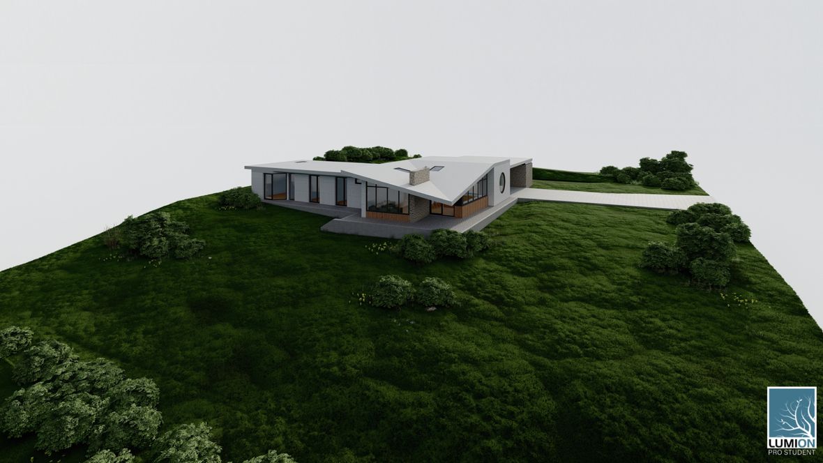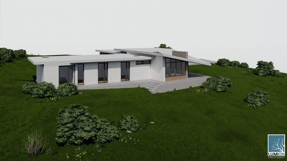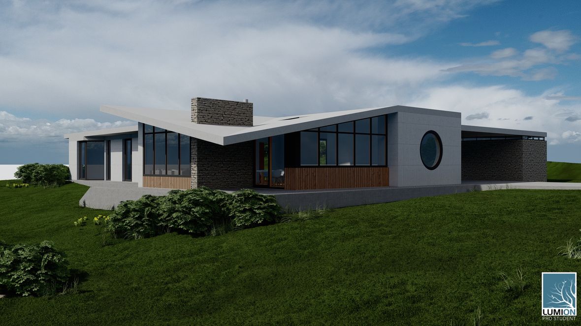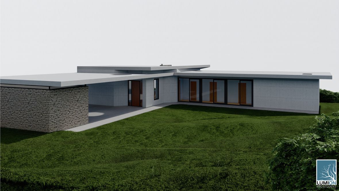Projekt rodinného domu pro čtyř člennou rodinu. Dispozice 4+kk se samostatný přístavkem sloužící pro sklad zahradních potřeb a jako kolárna. Svislé nosné konstrukce tvoří železobetonové sendvičové zdivo, z exteriéru je beton pohledový. Vodorovné nosné konstrukce a střešní konstrukce jsou navrženy jako železobetonové sendvičové monolitické desky. Kromě pohledového betonu se na fasádě nachází kamenný a dřevěný obklad. Okenní výplně tvoří hliníko-dřevěná okna. Střešní okna Velux jsou navržena v obytném prostoru v šikminách střešní konstrukce pro prosvětlení interiéru v celé hloubce. Světlíky Velux jsou navrženy v koupelnách a atypický kruhový světlík v exteriéru nad hlavním vchodem do objektu.