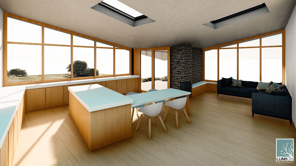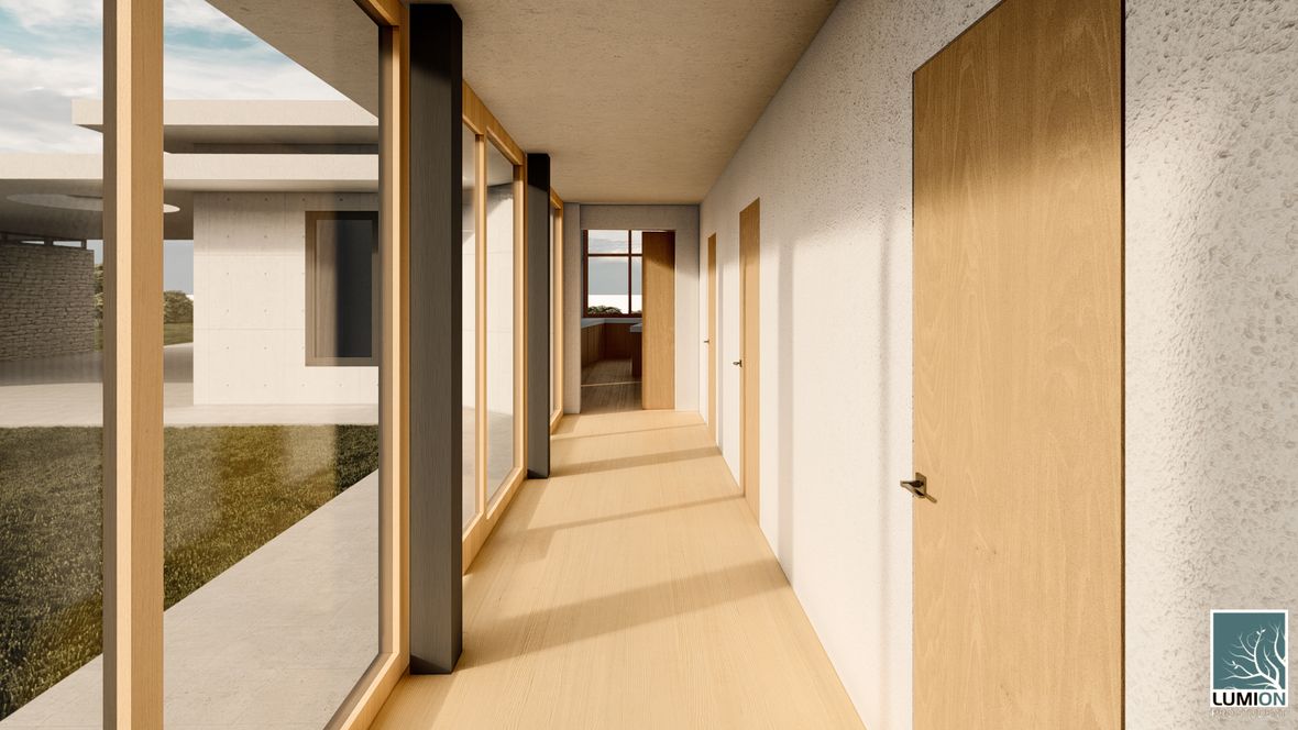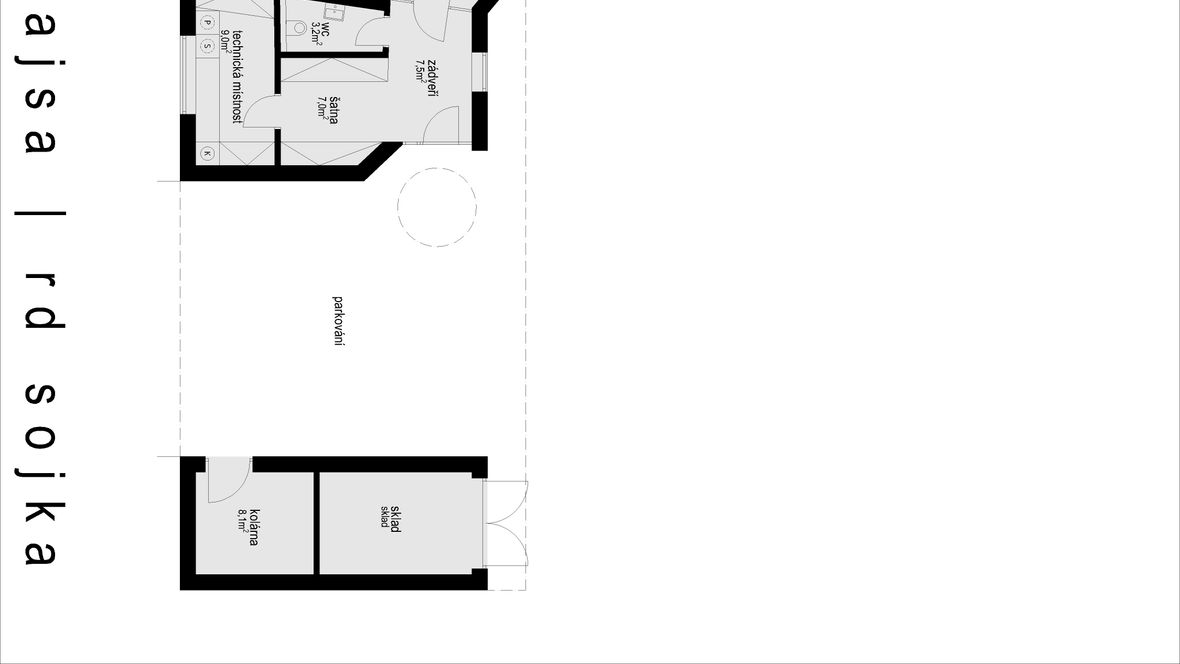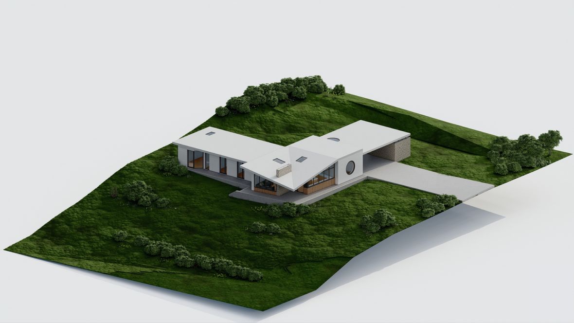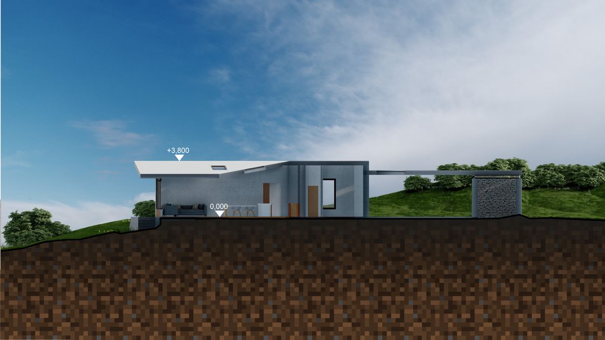 Projekt rodinného domu pro čtyř člennou rodinu. Dispozice 4+kk se samostatný přístavkem sloužící pro sklad zahradních potřeb a jako kolárna. Svislé nosné konstrukce tvoří železobetonové sendvičové zdivo, z exteriéru je beton pohledový. Vodorovné nosné konstrukce a střešní konstrukce jsou navrženy jako železobetonové sendvičové monolitické desky. Kromě pohledového betonu se na fasádě nachází kamenný a dřevěný obklad. Okenní výplně tvoří hliníko-dřevěná okna. Střešní okna Velux jsou navržena v obytném prostoru v šikminách střešní konstrukce pro prosvětlení interiéru v celé hloubce. Světlíky Velux jsou navrženy v koupelnách a atypický kruhový světlík v exteriéru nad hlavním vchodem do objektu.