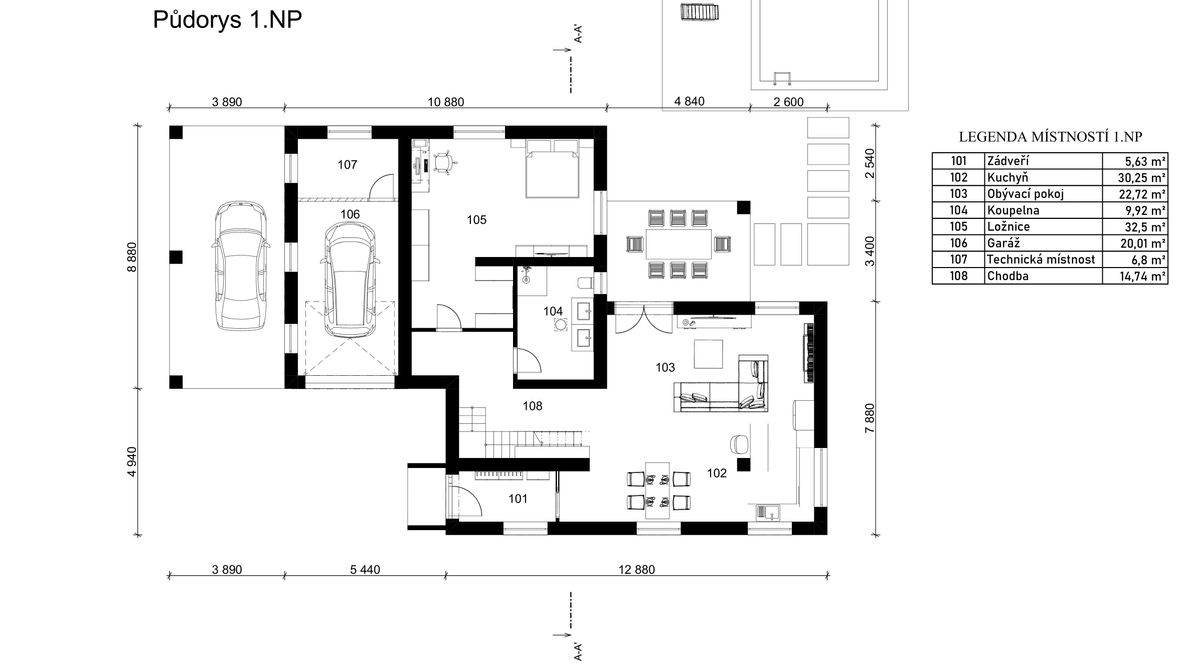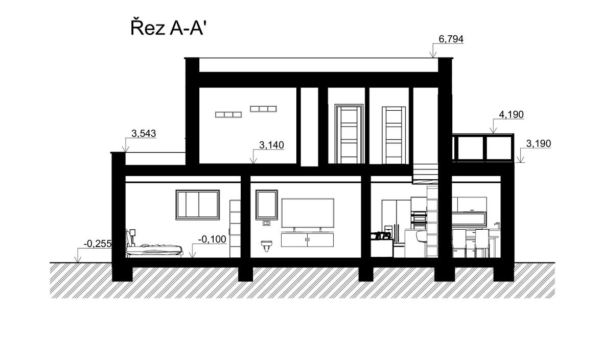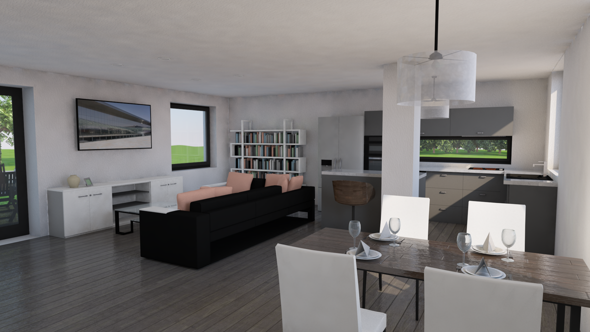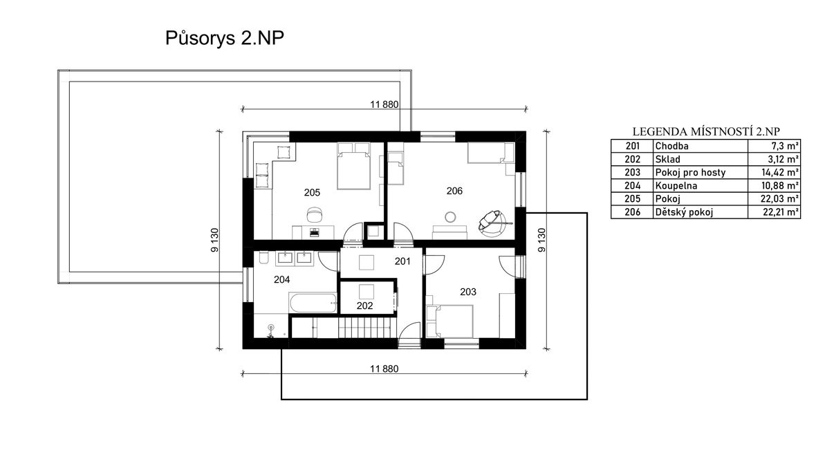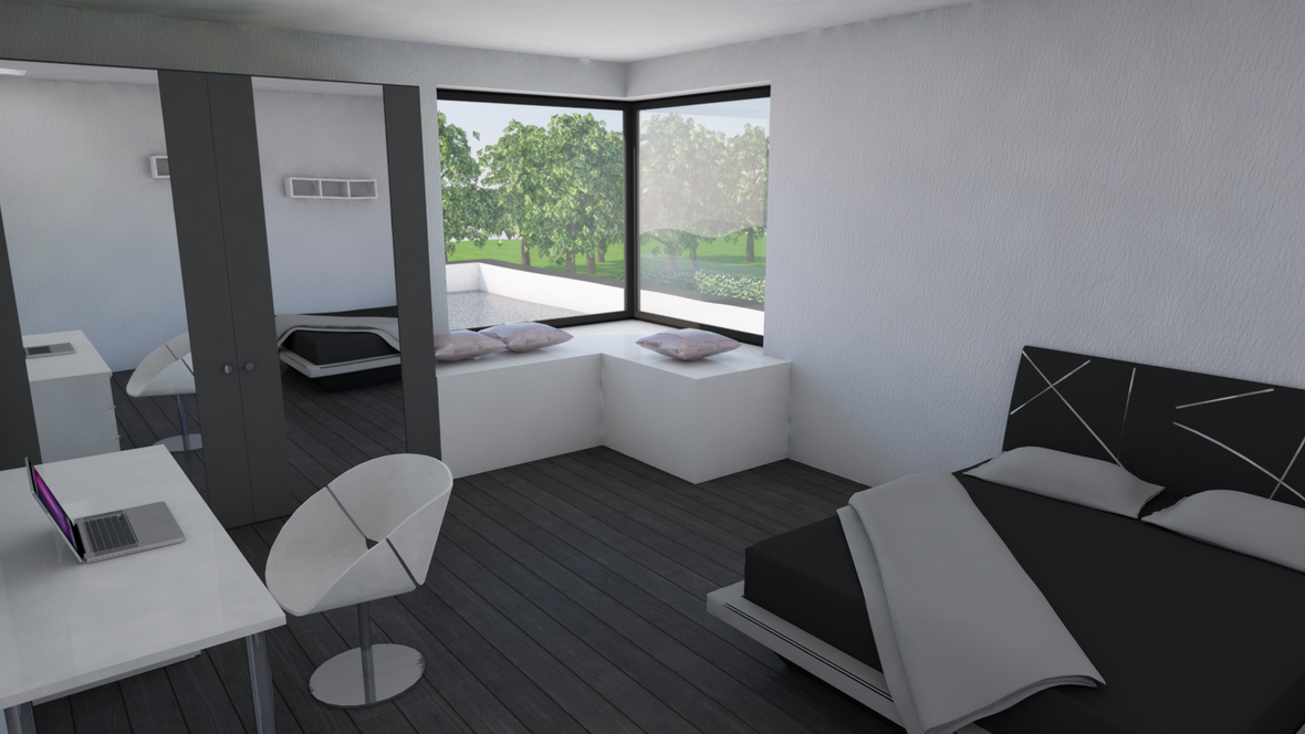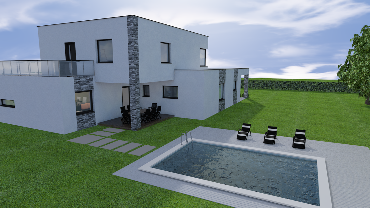 Cílem mého projektu bylo vytvořit trochu netradiční moderní rodinný dům s plochou střechou. Poukázat na to, že domy s plochou střechou nejsou jen nudné kostky. 1.NP se skládá ze dvou na sebe navazujících obdélníků, z propojené kuchyně s obývacím pokojem se dostaneme ven na stíněnou terasu a k bazénu. 2.NP je obdélník s přesahujícími rohy a skládá se z odpočinkových místností. Pomocí výrobků Velux jsem prosvětlila 2.NP a koupelnu v 1.NP.