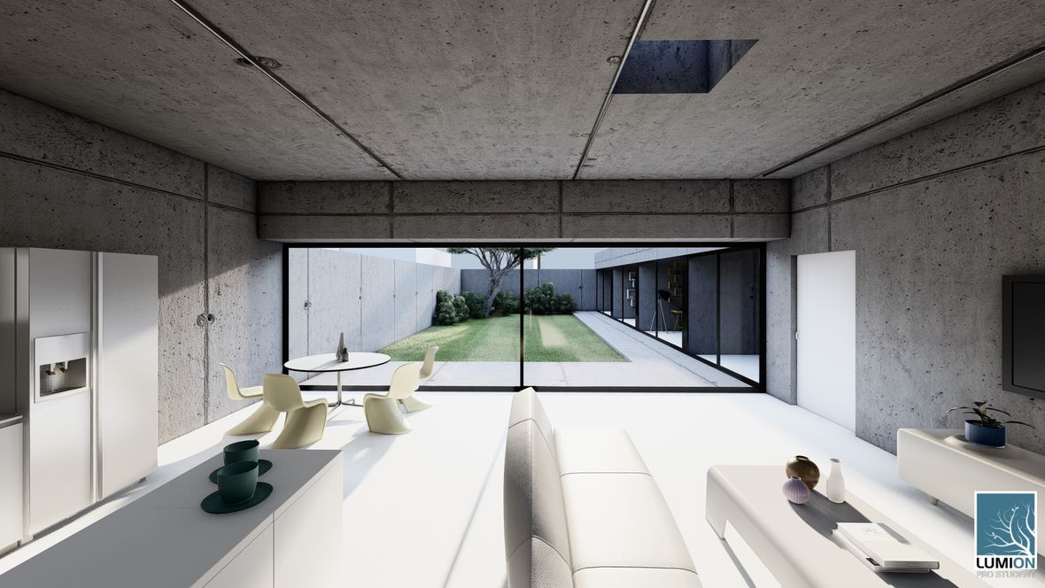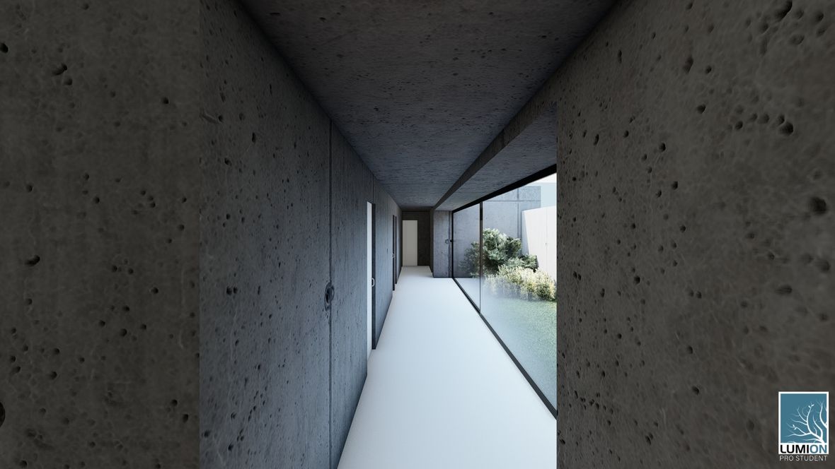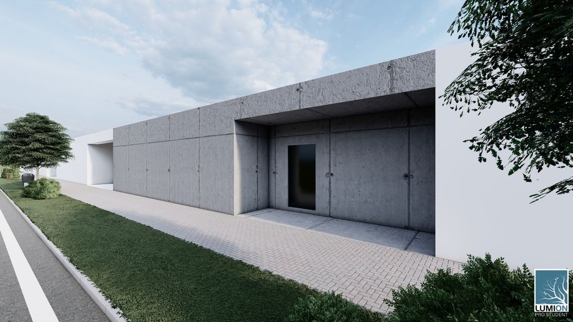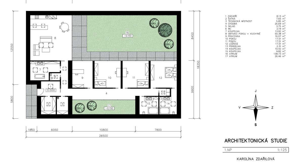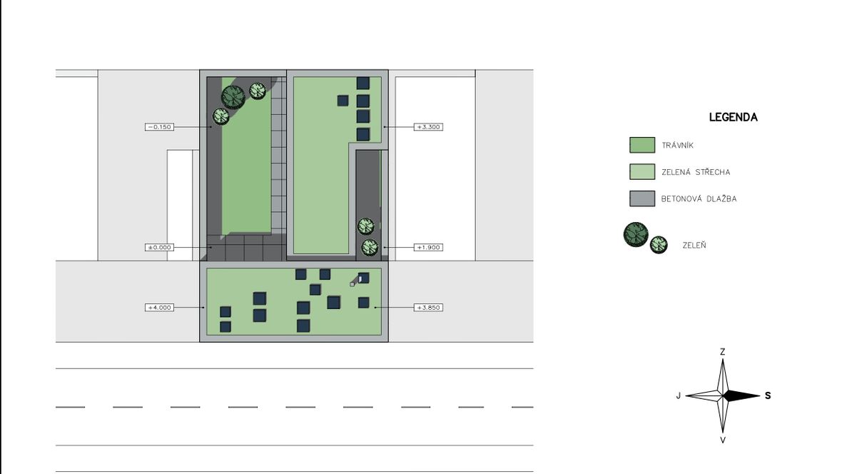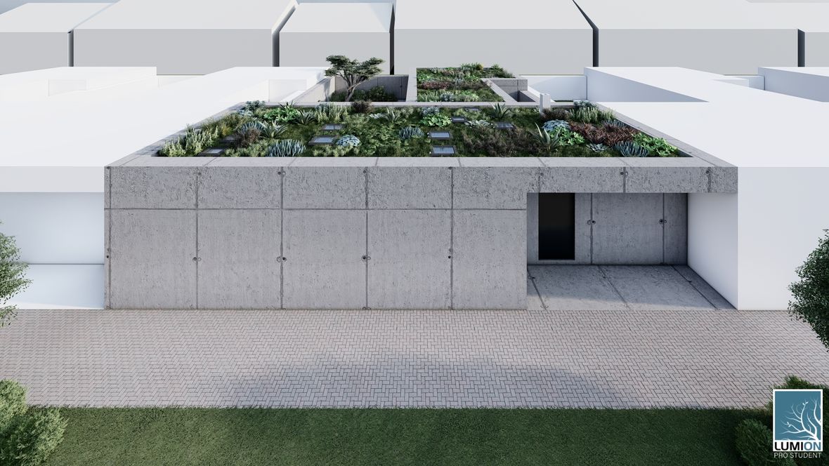 HLAVNÍ MYŠLENKA MÝM CÍLEM PŘI NÁVRHU BYLO VYTVOŘIT ŘADOVÝ DŮM V HUSTÉ ZÁSTAVBĚ, KDE I PŘESTO BUDE DOSTATEČNÉ MNOŽSTVÍ SVĚTLA. PROTO JSEM VYUŽILA SVĚTLÍKY A DVĚ ATRIA, KTERÉ PROSVĚTLUJÍ PROSTORY DOMU. OKNA, KTERÁ DO ATRIÍ SMĚŘUJÍ, JSOU POSOUVATELNÁ, ABY PROSTOR PŮSOBIL OTEVŘENĚ A CO NEJVÍC SE "SMAZALA" HRANICE MEZI INTERIÉREM A EXTERIÉREM. ARCHITEKTONICKÉ ŘEŠENÍ A DISPOZICE DŮM Z MONOLITICKÉHO BETONU JE SLOŽEN ZE DVOU ČÁSTÍ VE TVARU PÍSMENE L ZASTŘEŠENÝCH ZELENOU STŘECHOU. JSOU TAM TAKÉ DVĚ ATRIA, DO KTERÝCH VEDOU VŠECHNA OKNA V OBJEKTU. ŽÁDNA OKNA NESMĚŘUJÍ DO ULICE Z DŮVODU MAXIMÁLNÍHO SOUKROMÍ A MINIMÁLNÍHO HLUKU. Z HLEDISKA DISPOZICE JE RODINNÝ DŮM URČEN PRO ČTYŘČLENNOU RODINU A ROZDĚLEN NA SPOLEČENSKOU A KLIDOVOU ZÓNU.