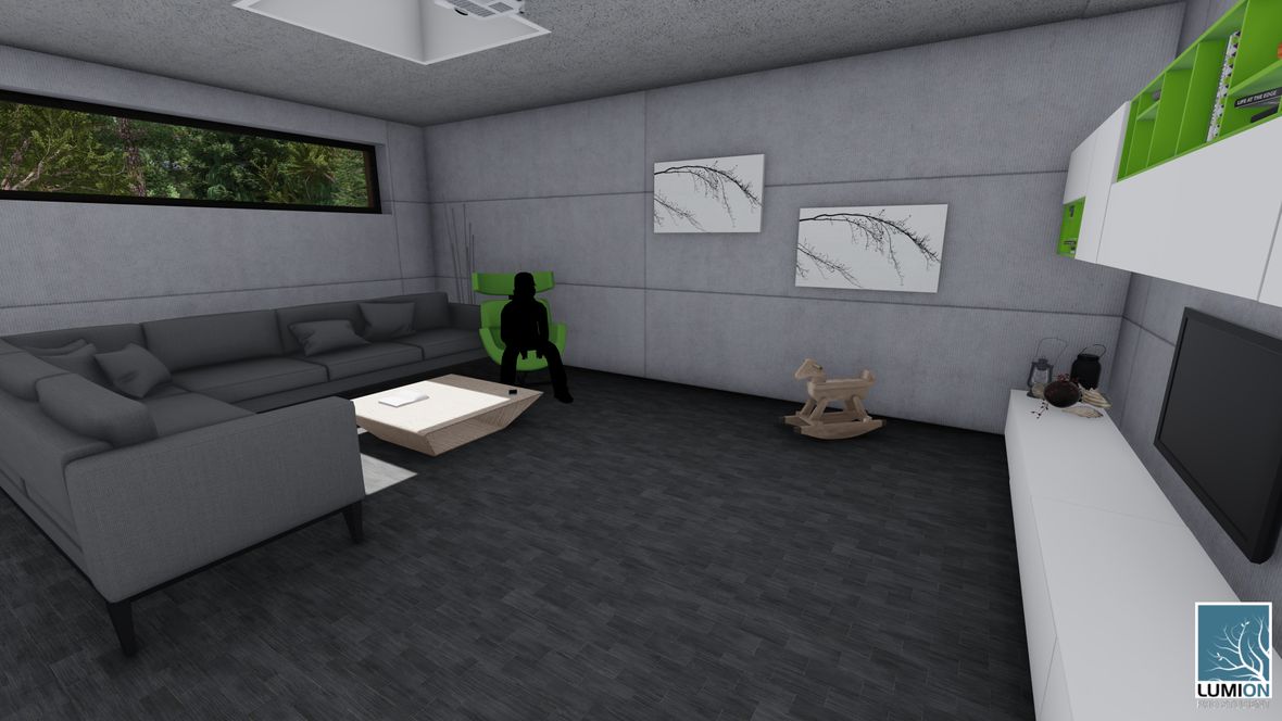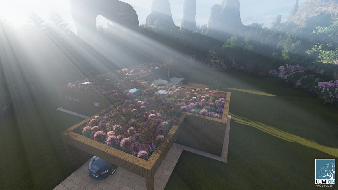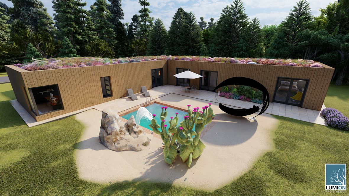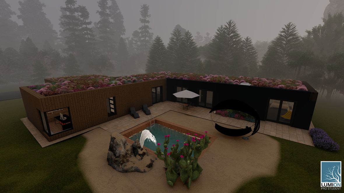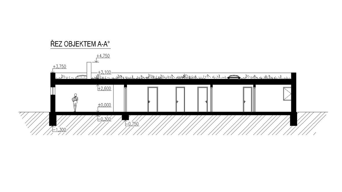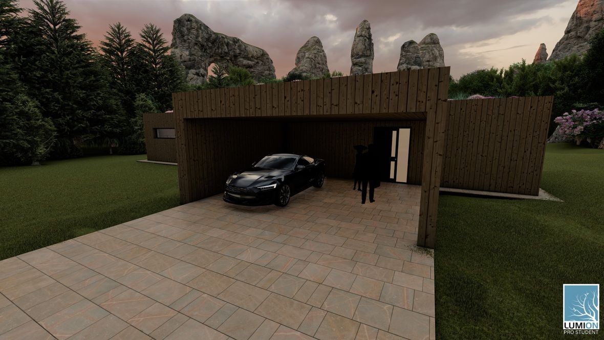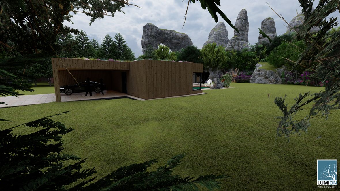 Dům je situován na rovinatém terénu v blízkosti opuštěného pískovcového lomu. Materiálové složení objektu bylo omezeno na dřevo, sklo a beton. Jejich kombinace vytváří jednoduchý a kontrastní design. Dřevěný obklad na fasádě a vegetační střecha má za cíl dokonalé splynutí s okolní krajinou. Prioritou bylo vytvořit příjemné a osvětlené místo s výhledem do přírody. Pro optimální osvětlení místností v domě je využito světlíků a světlovodů Velux. Objekt je určen pro 4-členou rodinu. Disponuje krytým stáním pro auto, překrásnou vzrostlou zahradou, venkovním bazénem a obrovskou terasou. Velký důraz je kladen na funkčnost i praktičnost bydlení. V celém domě je podlahové vytápění, okna mají navrženy venkovní žaluzie. Předností domu je oddělená klidová zóna od společenské. Všechny konstrukce jsou zděné ze systému Heluz. Dům využívá technologií tepelného čerpadla (země - vzduch), rovněž disponuje nádrží pro využití šedé vody pro toalety a zavlažování vegetace. Při poruše čerpadla je možné topit dřevem v krbu, který se nachází mezi jídelnou a obývacím pokojem.