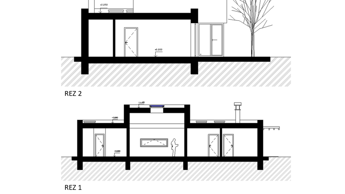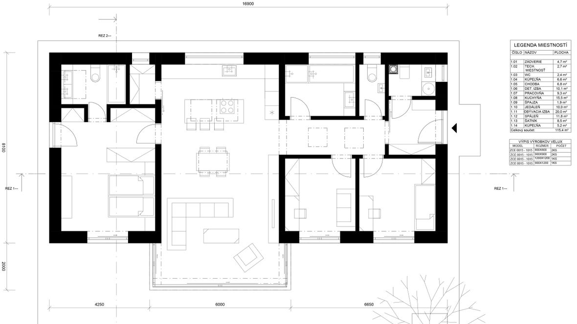 GLASS HOUSE je moderný jednopodlažný rodinný dom so zelenou plochou strechou pre 3 – 4 člennú rodinu. Mojim cieľom bolo vytvoriť jednoduchú, praktickú dispozíciu spolu so zaujímavou kompozíciou hmôt. To sa mi podarilo vďaka jednoduchej bielej fasáde, ktorú som skombinovala s tmavo sivým trapézovým fasádnym plechom. Tento plech taktiež jednotlivo ukazuje na vyvýšený strop v hlavnej časti domu a jeho presklenie z troch svetových strán. Ako tienenie som použila vonkajšie žalúzie ISOTRA. Týmto presklením a aj vďaka použitiu svetlíkov VELUX, ktoré domček odľahčujú a dodávajú pocit otvorenosti, som poukázala na to, že aj ploché strechy vedia veľmi prospešne využiť takýto typ prirodzeného svetlo a začleniť tak interiér do úzkeho kontaktu s prírodou.